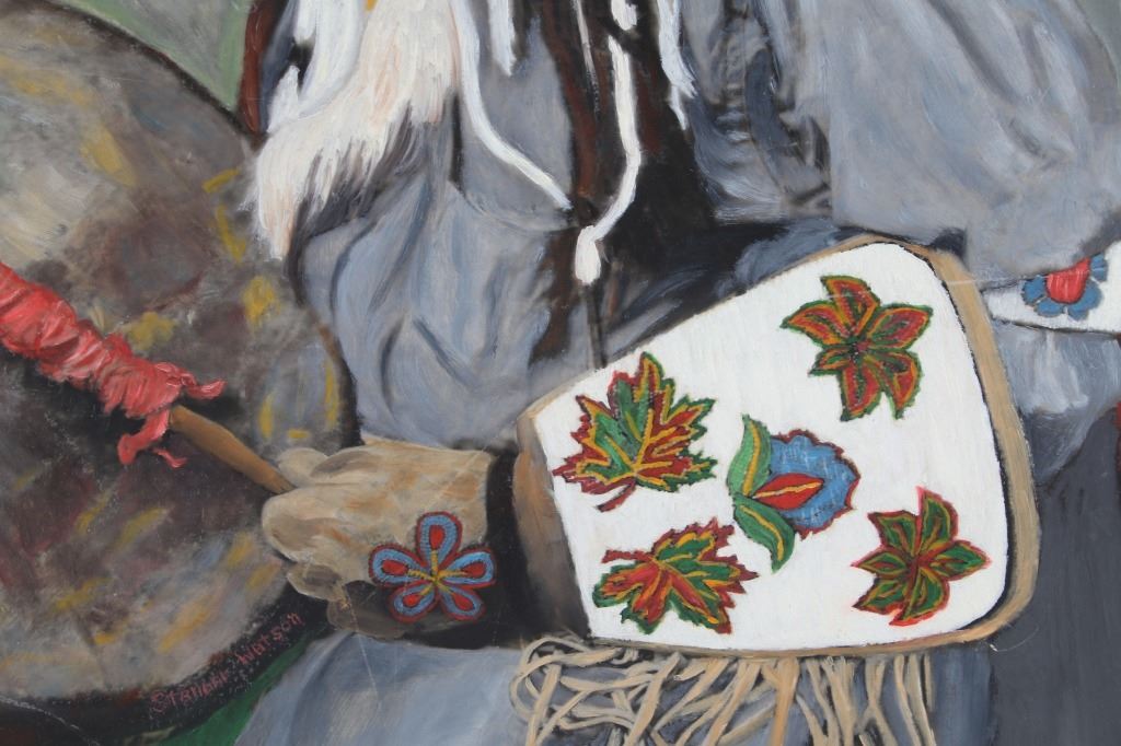 Featured in this lot is this original drumming Native man in Ceremonial Garments oil-on-board by Stanbar C Watson. The oil painting is wonderfully crafted with a beautiful painting including bright floral gauntlets and a headdress. The artist’s signature can be seen in the bottom left-hand corner. The condition of this framed oil painting is fair, with some scuffs to the artwork itself. The measurements of this framed oil-on-board are 25 1/4" x 21 1/4" and the visible art measures 23 1/2" x 19 1/2". Provenance: This is from the personal artist Margie Jackson.