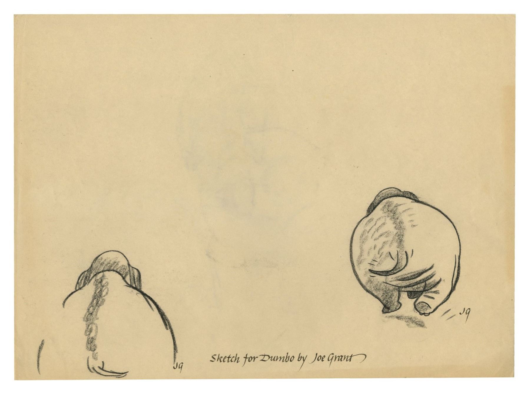 (Walt Disney Studios, 1941) An original model drawing by Disney Legend Joe Grant featuring a pair of elephants from the feature film Dumbo. After the film was completed, Grant titled and signed the production drawing in ink then gave the drawing as a gift. Created in pencil on thin art paper, the drawing measures 8.5"x11.5" and is in very good condition.