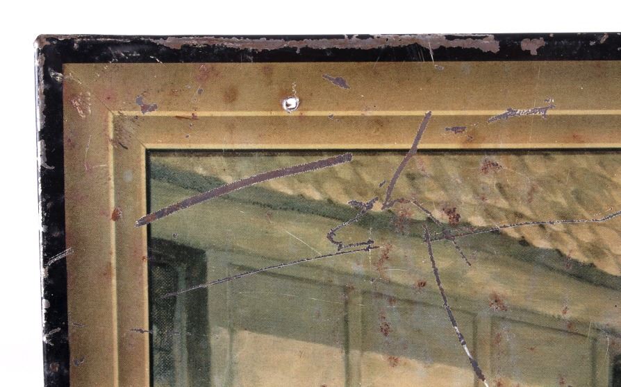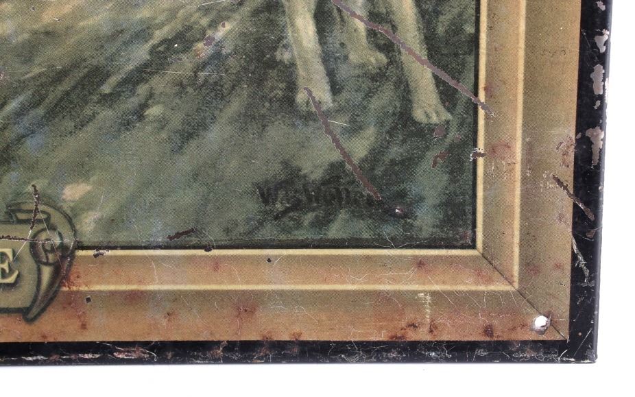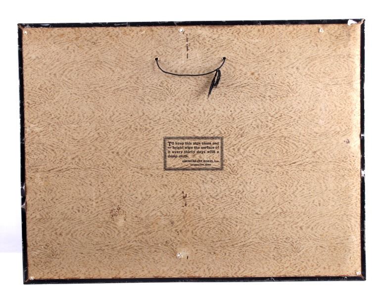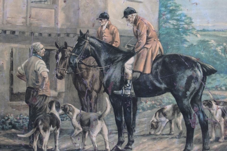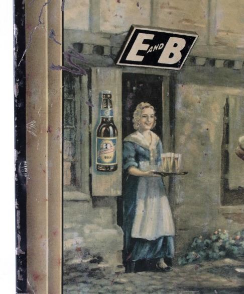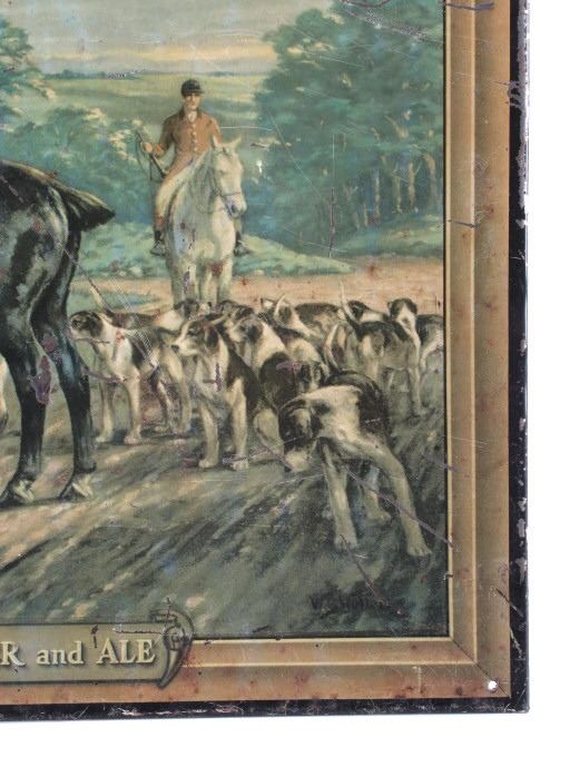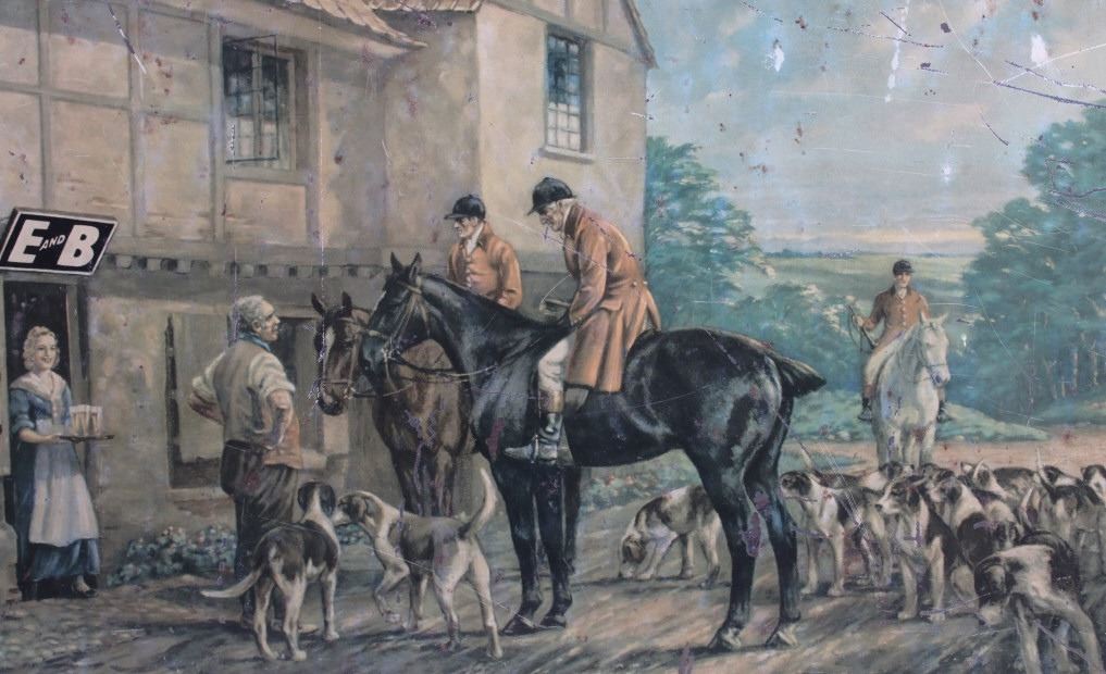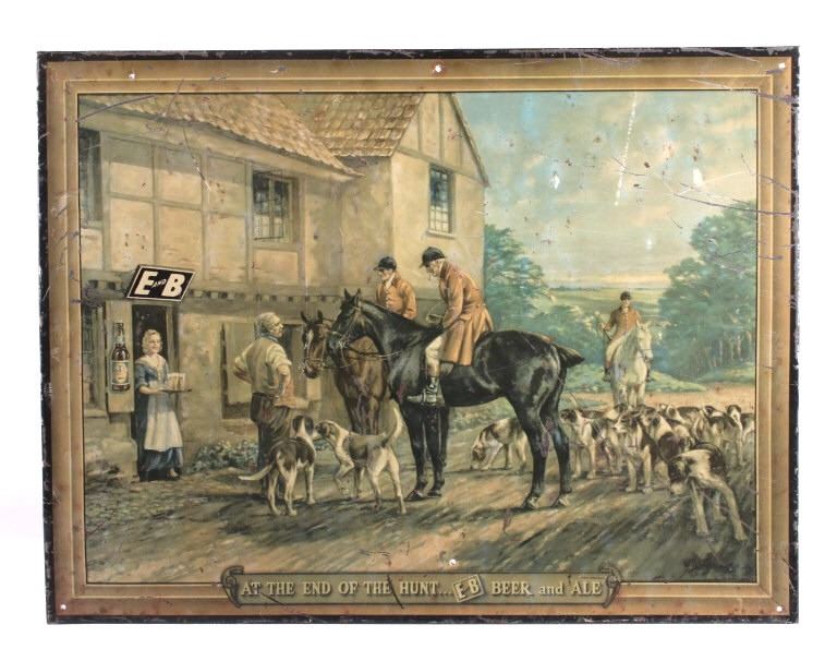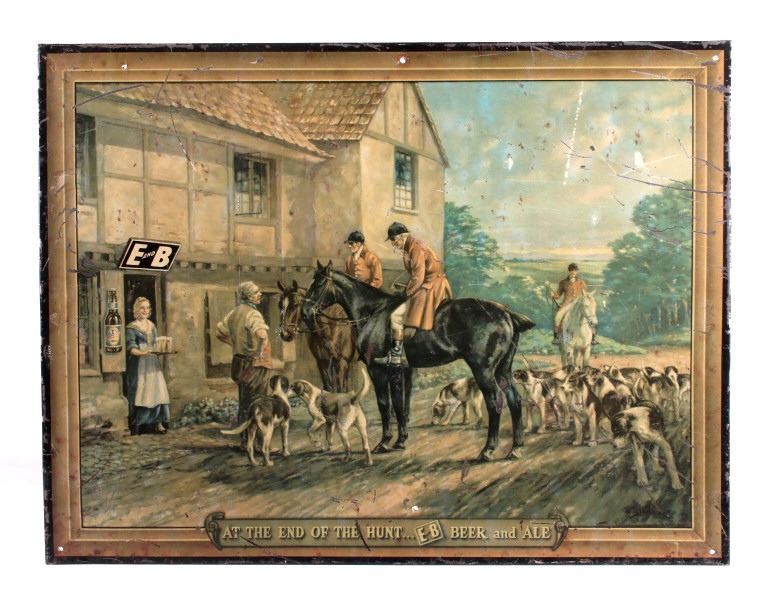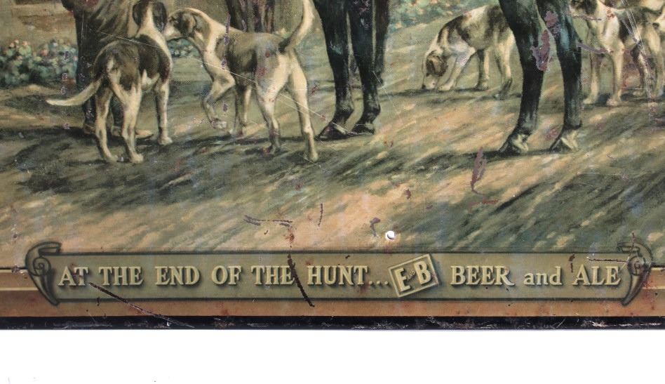 This is an original E&B Beer & Ale advertising sign. The sign is tin over cardboard and features a hunt scene with hunters and hounds at an ale house. The bottom of the sign reads "At the End of the Hunt... E and B Beer and Ale". The back of the sign is marked "American Art Works, Inc. Coshocton, Ohio". The sign shows fair to good overall condition. It measures 15.5" x 20.25".