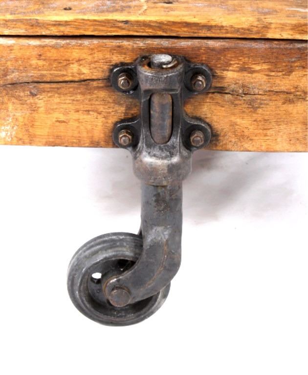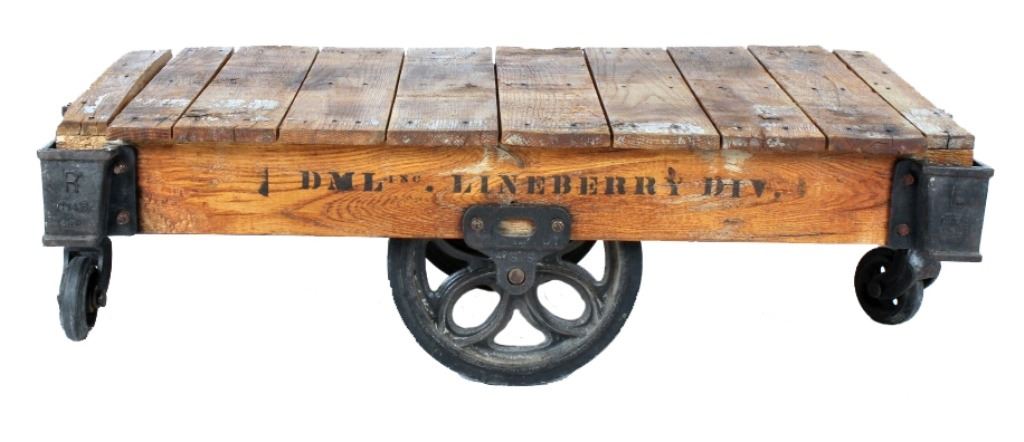 Featured in this lot we have a original early 1900's DML inc. Lineberry factory cart. The Lineberry factory cart was created at the start of the industrial revolution as an easy way for factory workers to move and transport items quickly. It was a staple in the industry for many years and is regarded as the best in the industry. These factory carts, also known as railroad carts, are highly sought after for use as coffee tables, garden carts, side tables, or display tables. Its unique and ruggid look makes it perfect for Montana ranch homes, hunting cabins, or barn lofts. The cart is constructed out of solid oak boards with cast iron wheels and fittings and has had some minor restoration. The art is marked "DML INC. LINEBERRY DIV." on the side and the cast iron plated are marked "L - C 14 L" or "R - C 14 R". The cart is in very good condition, with some scuffs and wear on the top of the cart due to age. The cart measures 53" long by 28" wide by 15 1/2" tall.