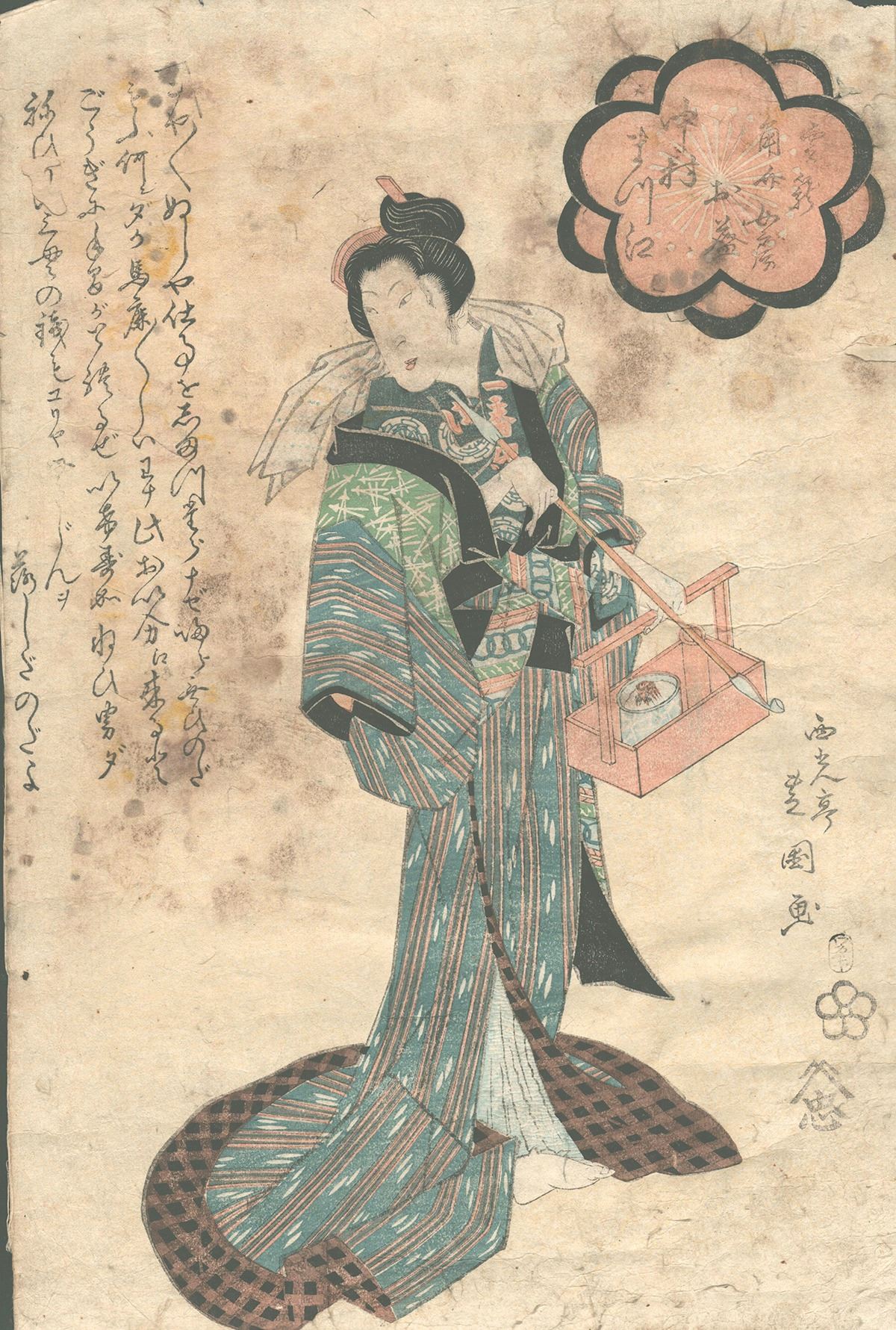 Original Edo era Japanese Woodblock Print, Oban, approximately 14 1/2" x 9 1/2", This print with nice detail as shown. Some staining. Repaired. See photo for details