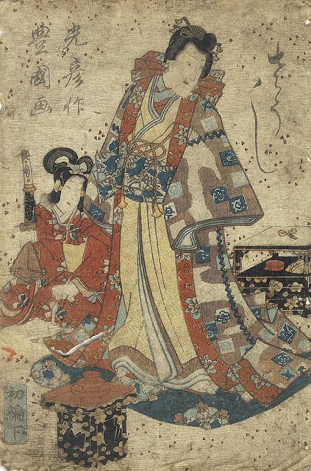 Original Edo era Japanese Woodblock Print. Measures at 6 7/8" x 4 3/4". This print with nice color and detail as shown. Toning and staining. Please see photos for details.