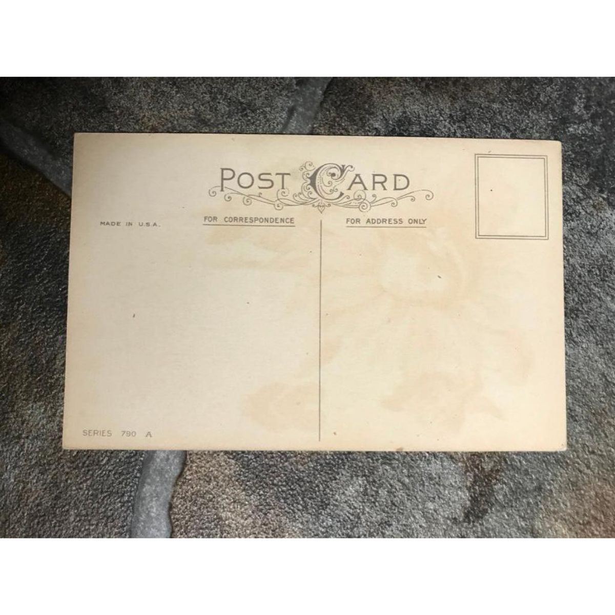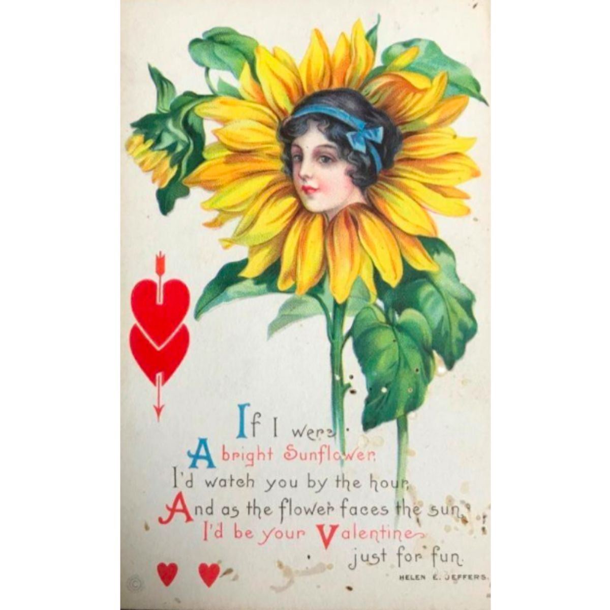 Original early 1900's Edwardian era chromolithograph Valentine's Day postcard of a girl's face inside a sunflower, with a poem by Helen Jeffers. Bright colors but with small losses to front per photo.