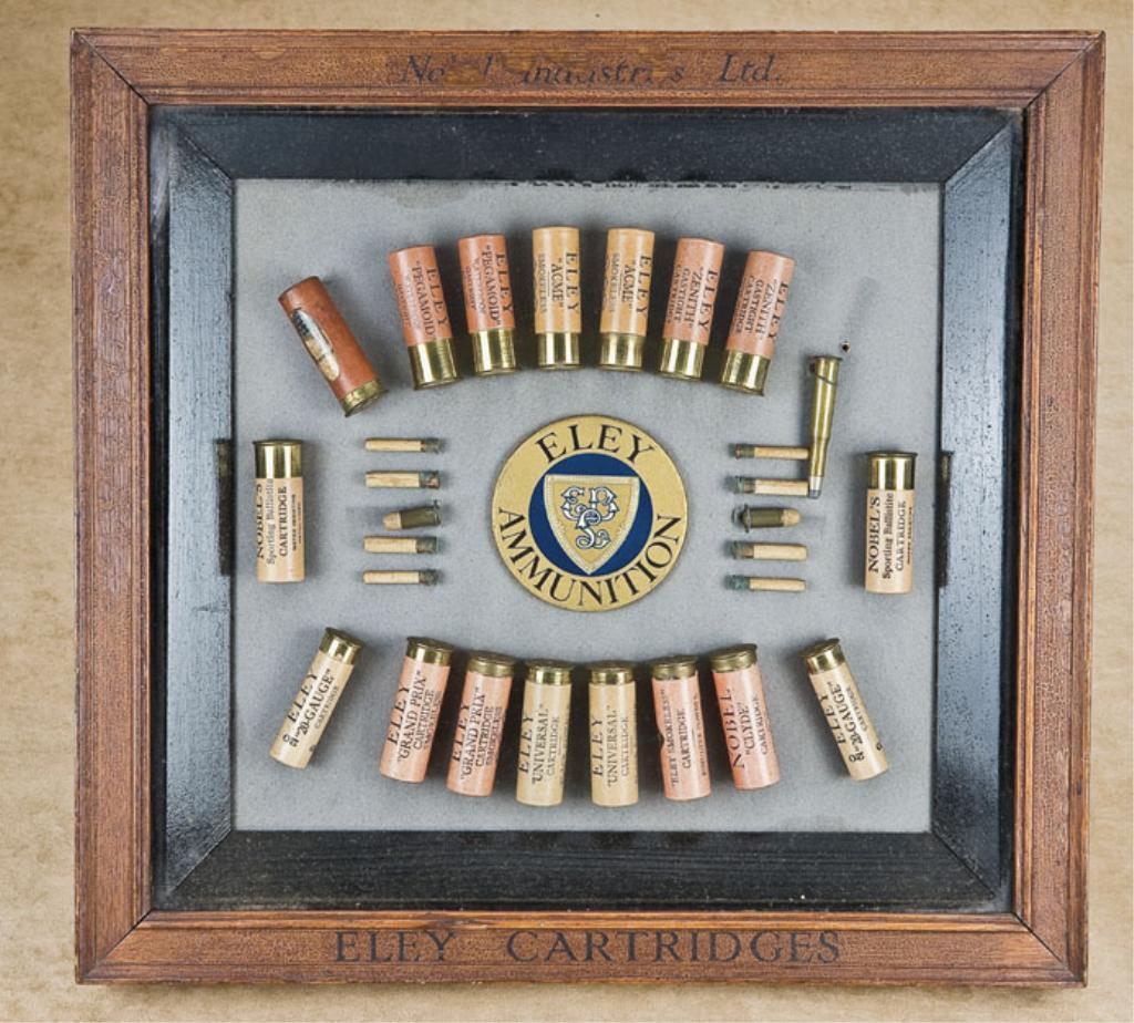 Original Eley cartridge board advertiser measuring approx. 16”(h) by 17’(w) showing company markings on frame, Nobel industries, Eley Cardridges. The board is in good condition with some fading, the frame shows some cracking and damage to varnish, generally good. Hugh Hayes Collection. Est: $750 - $1,500