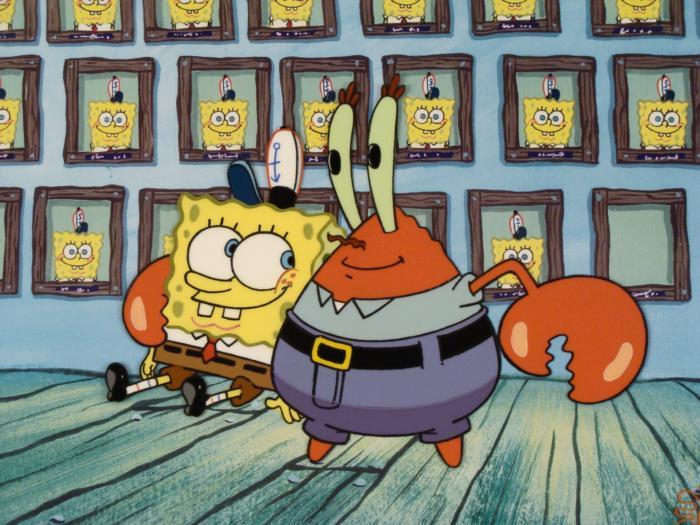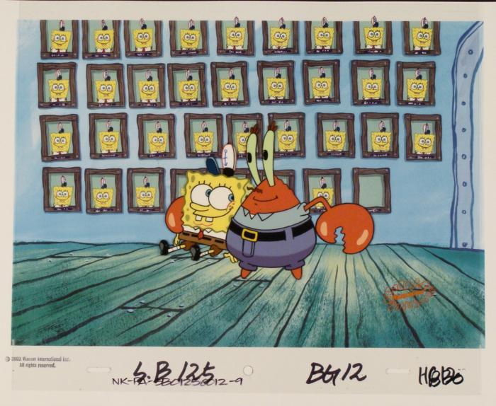 This animation cel and reproduction background are from the Nickelodeon TV show SpongeBob Squarepants. The story takes place under the deep blue sea in Bikini Bottom, where SpongeBob resides. SpongeBob, who is a yellow, porous sponge, is your typical happy-go-lucky character, as he is always cheerful and enjoys making people laugh. Patrick Star, SpongeBob's neighbor who is a starfish, is your average children's show idiot, as he boasts knowing nothing and is often getting himself into ridiculous situations. Between the homes of these two lies the home of the miserable Squidward, a squid, who is known for being grouchy and playing tricks on SpongeBob and Patrick. Both SpongeBob and Squidward work at the Krusty Krab, a fast food business run by the greedy money-loving Mr. Krabs, a crab, the arch rival of the evil, possibly misunderstood, Plankton. Another neighbor, Sandy Cheeks, an athletic squirrel who normally wears an astronaut's space suit, was introduced in "Tea at the Treedome." She spends most of her time inventing and experimenting. Who will be the employee of the month?Original Printed Background and Animated Cel Overall Size of Background: 10 1/2" x 17" Overall Size of the Cel: 10 1/2" x 12 1/2" Very good condition This is an original hand-painted cel set-up used in the production of an episode of "SpongeBob SquarePants." Each one-of-a-kind set-up represents a slight change in position of the characters. When individually photographed and projected in rapid succession, the images appear to move.
