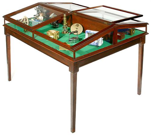 Showcase in Size 2: Original English Mahogany Showcase, c. 1890 Table or wall mounting! With original stand, sizes of the showcases: height of the stand: 33 in. 1) 81 x 59 x 10 in., inside measures at front: 4 1/3 in., at rear: 8 1/3 in. – 2) 60 x 49 x 10 in., inside measures at front: 4 1/3 in., at rear: 9 in. – Very useful and decorative for any major collection!<Br>