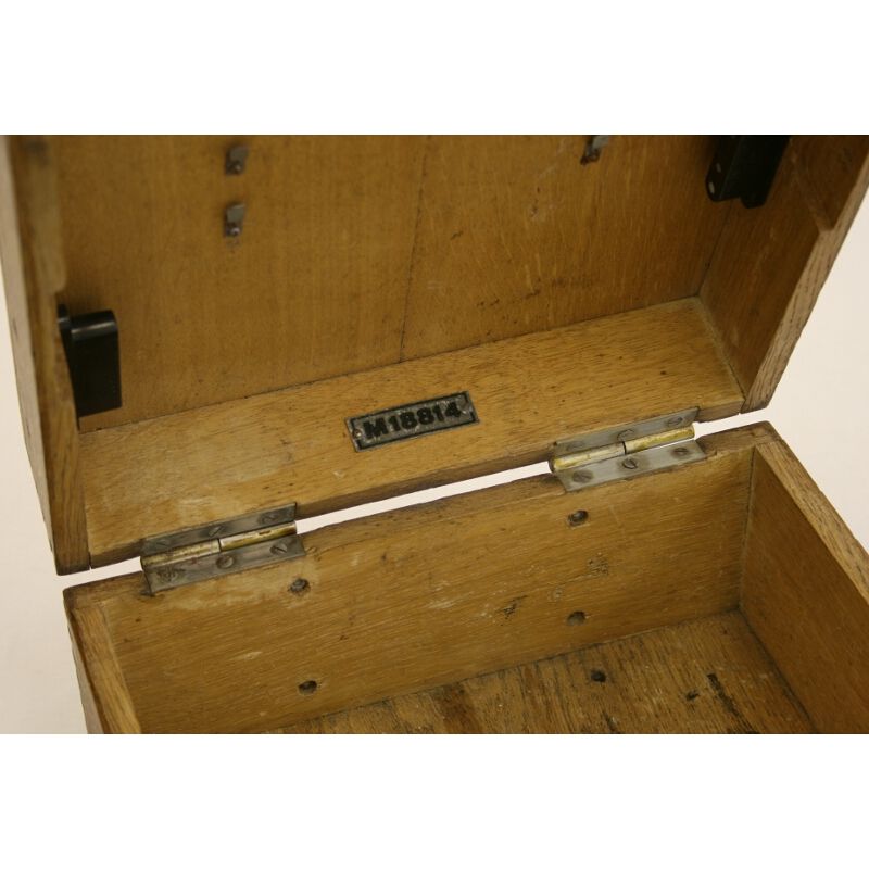 The internal ID plate - M18814 - indicates the Enigma machine that the box once contained was made in 1945 with the serial number almost certainly that of M18814/aye/45 manufactured in Erfurt, Germany by Olympia in 1945.