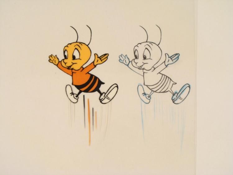 Here, it appears that Buzz is excited. This is an original animation cel & drawing from the production of the Cheerios cereal commercial. * Medium: Hand painted acetate cel with drawing * Cel size: 10 1/2 x 12 1/2 inchesDrawing size: 10 1/2 x 12 1/2 inches * Details: Number and peg holes at the bottom edgeCondition: Very goodPencil color: non-photo blue and black