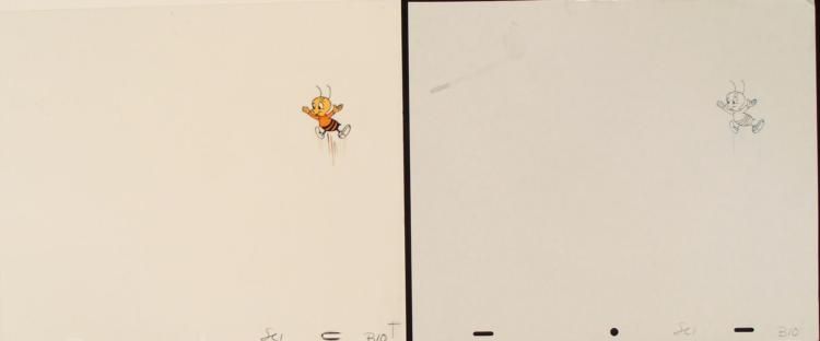 Here, it appears that Buzz is excited. This is an original animation cel & drawing from the production of the Cheerios cereal commercial. * Medium: Hand painted acetate cel with drawing * Cel size: 10 1/2 x 12 1/2 inchesDrawing size: 10 1/2 x 12 1/2 inches * Details: Number and peg holes at the bottom edgeCondition: Very goodPencil color: non-photo blue and black