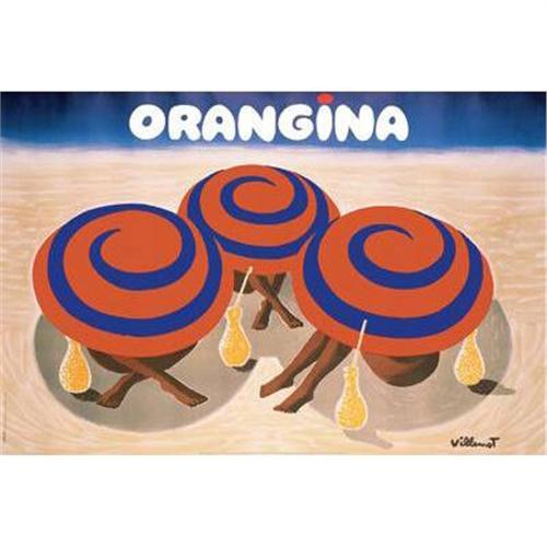 This is a dynamic, well-known poster from the prolific posterist Villemot. Large horizontal format with the three umbrellas on the beach. Over a thiry-year period starting in 1955, Villemot executed something like twenty designs for Orangina. Most of them featured a red swirl of some sort?-beach umbrellas (as is the case in this 2-sheet design), hats, orange peels, spectacles, even hair curls-?which has become associated with the product, giving it a young upbeat image.