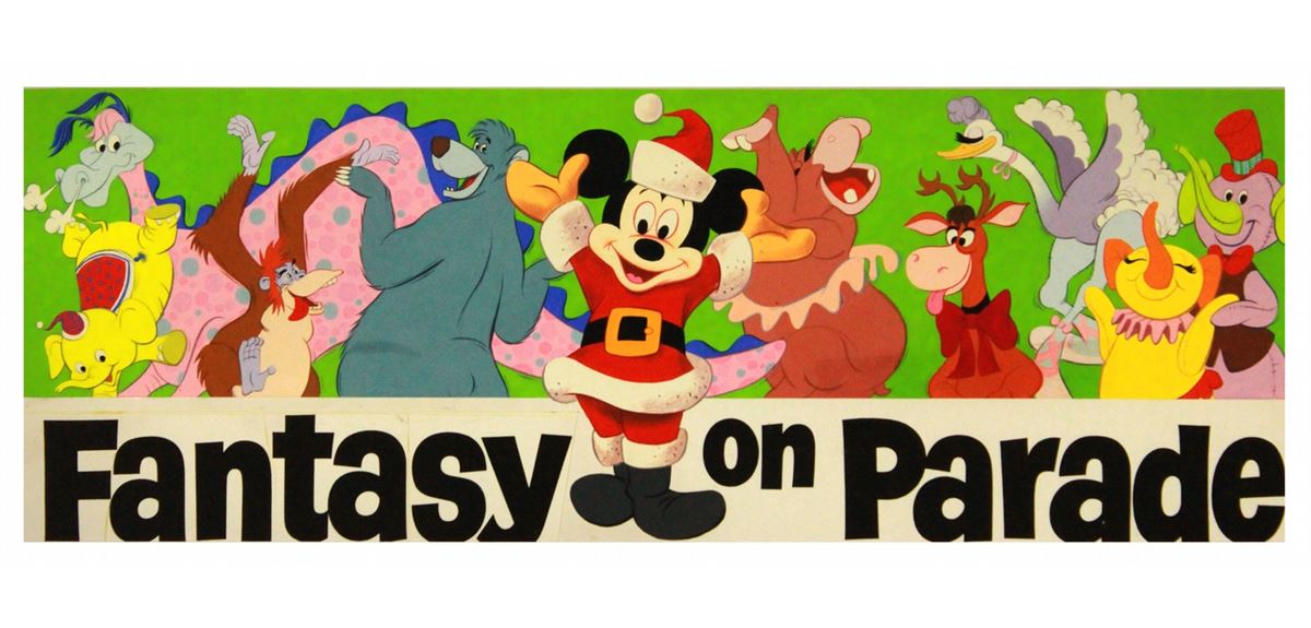 (Disneyland, 1968) Beautiful original painting produced for a Billboard advertising the new Fantasy on Parade attraction at Disneyland. The artwork measures 8.5 x 23.5 in. and is in fine condition. Unexamined out of frame.