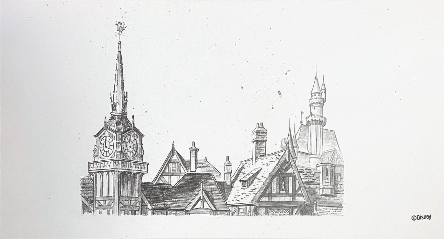 (Disneyland, c. 1990s) An original production drawing of Disneyland's Fantasyland. Accomplished in pencil on artist's leaf mounted to illustration board, the artwork depicts the Fantasyland skyline with Sleeping Beauty Castle in the distance. The piece is stamped with a Disney copyright mark at lower right. An acetate sheet with a black silhouette version of the image overlays the drawing, with a vellum overlay over top. The artwork measures 6.25"x8.5" on a 7.5"x14.25" leaf and the board is 15"x20". The piece is in good condition with some (possibly intentional) paint splatter in the background. The board exhibits some darkening around the edges with corner bumping and wear.