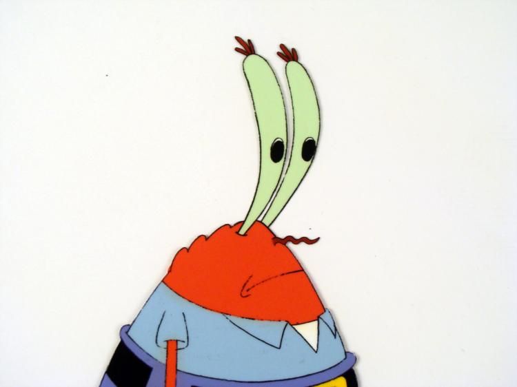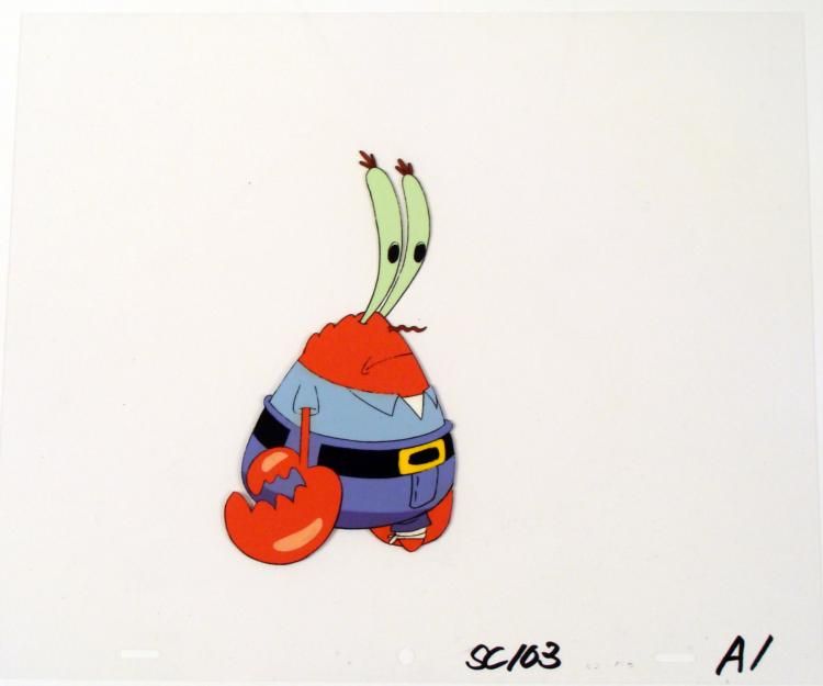 This original animation cel is from the Nickelodeon TV show SpongeBob Squarepants. The story takes place under the deep blue sea in Bikini Bottom, where SpongeBob resides. SpongeBob, who is a yellow, porous sponge, is your typical happy-go-lucky character, * as he is always cheerful and enjoys making people laugh. Patrick Star, SpongeBob's neighbor who is a starfish, is your average children's show idiot, as he boasts knowing nothing and is often getting himself into ridiculous situations. Between the homes of * these two lies the home of the miserable Squidward, a squid, who is known for being grouchy and playing tricks on SpongeBob and Patrick. Both SpongeBob and Squidward work at the Krusty Krab, a fast food business run by the greedy money-loving Mr. Krabs, a * crab, the arch rival of the evil, possibly misunderstood, Plankton. Another neighbor, Sandy Cheeks, an athletic squirrel who normally wears an astronaut's space suit, was introduced in "Tea at the Treedome." She spends most of her time inventing and experimenting. * * What brought Mr. Krabs spirit down?? * * * * * Original Production Animated Cel Overall Size of Cel: 10 1/2" x 12 1/2" Very Good Condition * This is an original hand-painted cel was used in the production of an episode of "SpongeBob SquarePants." Each one-of-a-kind cel * represents a slight change in position of the characters. When individually photographed and projected in rapid succession, the images appear to move. * * To create production cels, the original animator's drawing is transferred onto an acetate cel (by hand-inking and/or photo copying). The cel is then hand-painted on the reverse side. * * * * * The cel received by the winning bidder may be every so slightly different from that in the auction photo. * * * * The cel is ready to be matted and framed. The animator's notations are at the bottom of the cel. There is some slight paint fade to Mr. Krab's outline. * * *
