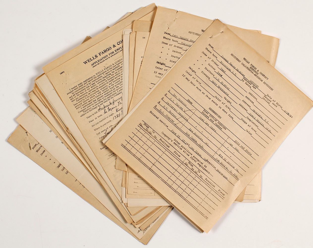 Archive of ~50 documents comprising hiring papers for employees at the Southern California-Arizona Division (Los Angeles) of Wells Fargo, c.1910s. Each employee file has their application plus reference forms. Employees include: Frederick Henry Martin (1911), William Albert Myers (1912), John Edmund Pace (1913), Joseph Henry Richley (1911), Claude Eber Olewiler (1912), Archie F. Lehnberg (1915), Arthur Truman (1913), L.L. Ostrow (1913), and more. Interesting look into this iconic express company. Please inspect. (Prag Collection) Date: 1911-1913 Location: Los Angeles, California HWAC # 55638