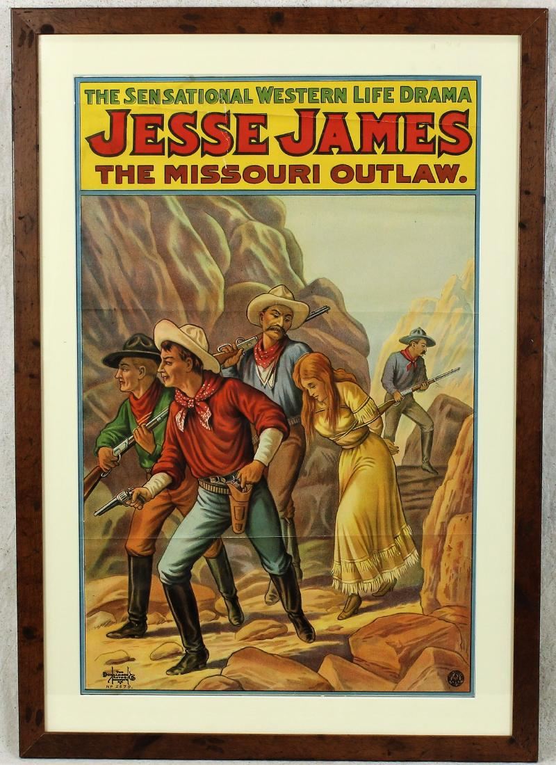 Early poster titled "Jesse James the Missouri Outlaw," done by Donaldson Litho Co., showing vivid colors and great subject. Professionally matted and framed, sight measuring 28" x 18".