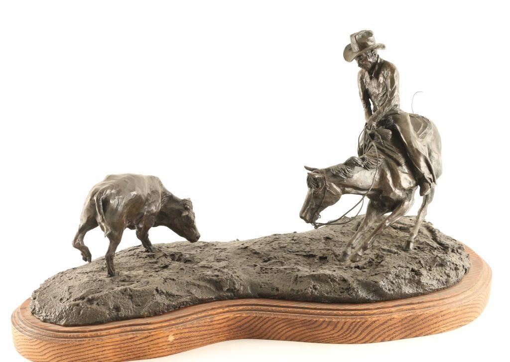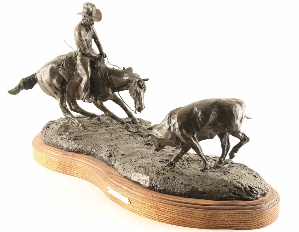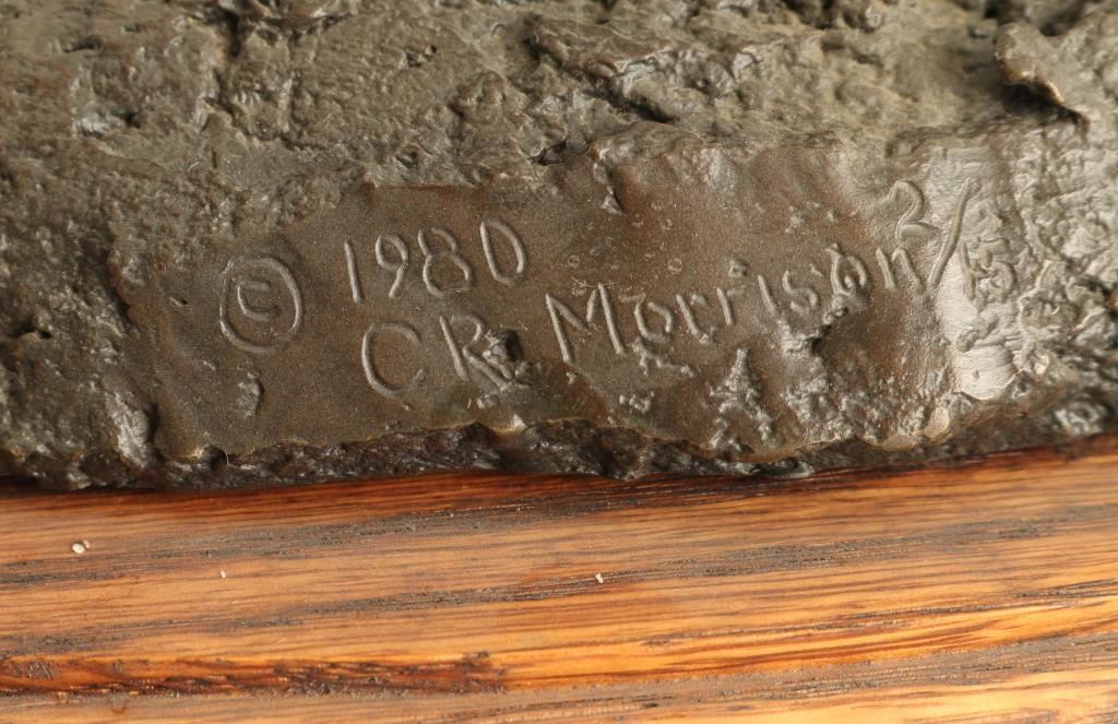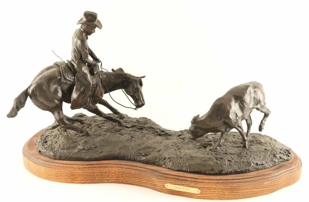 entitled "Mutual Respect", #2/15 numbered and signed on base. Measures 28" x 15" x 13". BIO- Clarence or C.R. Morrison is a world-renowned sculptor who was born at his family's homestead in the Sweet Grass Hills of north central Montana, a working cattle and sheep operation that eventually became a ranch of over 6000 acres. He presently lives with his wife on their ranch near Clyde Park, Montana. Morrison's work has been commissioned by galleries and collectors throughout the United States and the C.R. Morrison trophies and medals awarded by the American Quarter Horse Association and the National Reining Horse Association are among the most coveted in equine competition. His horse sculptures are considered among the most beautiful in the world and are noted for their expression of form and movement. Clarence is famous for his sculptures of horses, wildlife, and ranch scenes of the western United States.