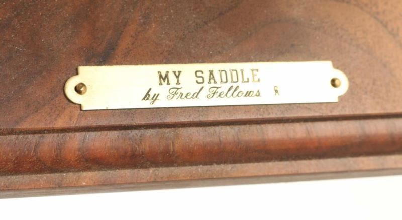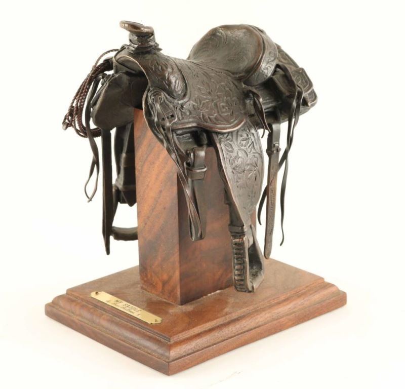 by Fred Fellows entitled "MY SADDLE", signed, #39/100, measures 6"X5"x8". BIO- Fred Fellows had early exposure to ranching and Otoe and Osage Indian reservations. As an artist, he is self-taught, and earned membership (and in 1997 presidency) of the Cowboy Artists of America. Fred Fellows grew up in California where he worked as a cowboy and apprenticed for four years to a saddle maker. Later attended Art Center School in Los Angeles and began a successful career in the aircraft industry. In 1964, he moved his family to Big Fork, Montana to devote himself to painting, while also spending his spare time roping for the big Montana cow outfits.