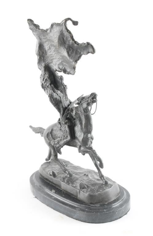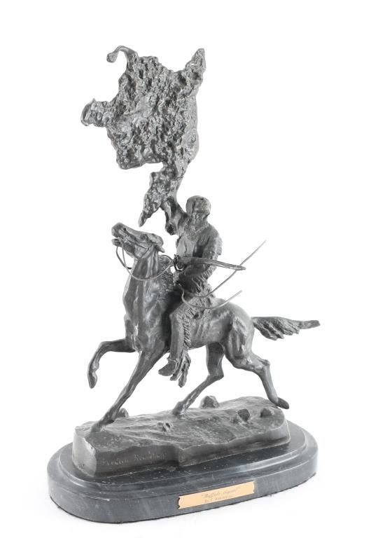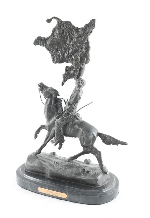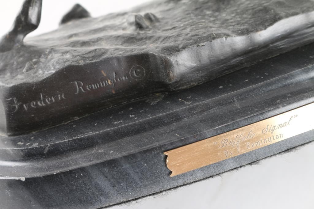 By cowboy artist Frederic Remington entitled "Buffalo Signal", signed on base mounted on granite base. Measuring 16x7".