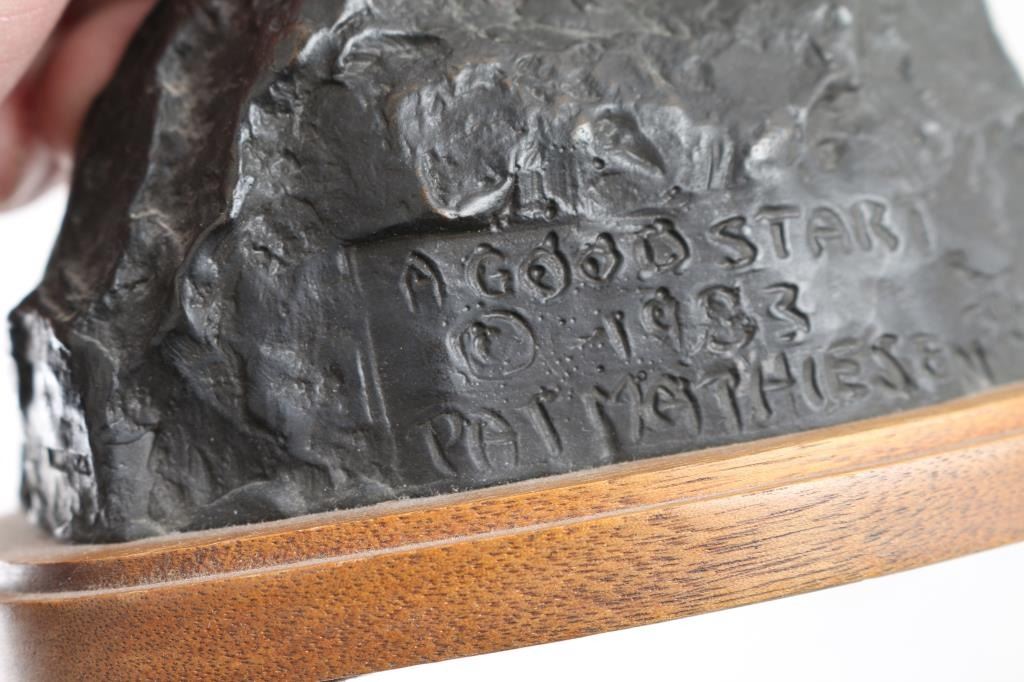 By famous Arizona artist "Pat Mathiesen" entitled " A Good Start" signed on base and dated 1993. Measures 8x5.5. Bio-Pat Mathiesen, a painter and sculptor of Native Americans, wildlife and other Western subjects, was born on January 15, 1934, in North Hollywood, California, growing up there. Some of her sculptures include "Wyatt Earp at the O.K. Corral;" "Spirit of Crazy Horse;" "After the Battle at Wounded Knee;" "The Steer Buster;" and "Apache Mountain Spirit Dancer." Horses are the subjects of two major commissions in the early 1970s for the American Quarter Horse Association, in Amarillo, Texas. Mathiesen's twenty-four-foot-high Indian, "One With the Eagle," was sculpted in 1989 for the Scottsdale Airport in Arizona.
