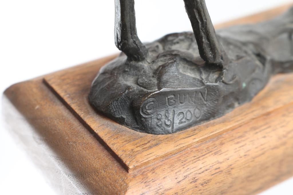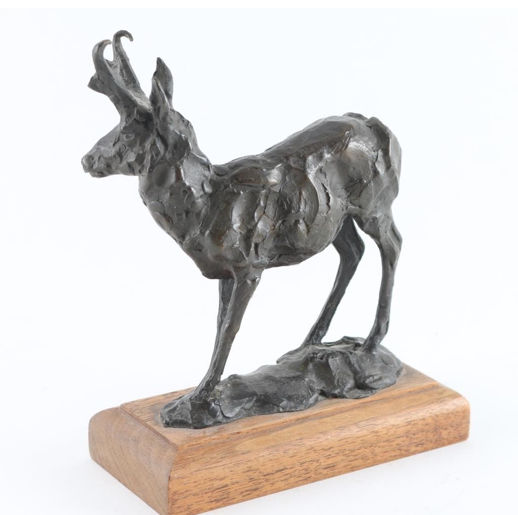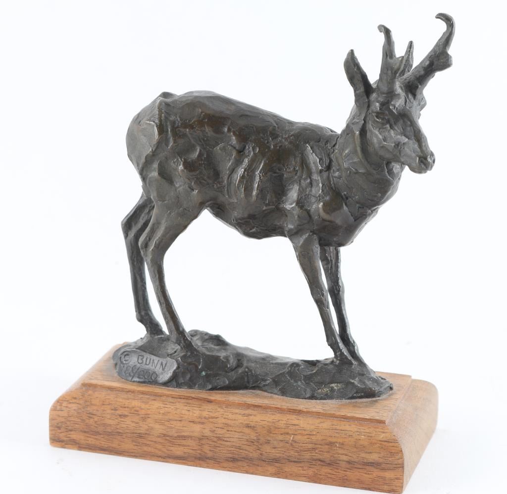 By artist "Bunn" signed on base, "No title" depicts antelope mounted on wood base. In good condition. Measures 5"x5.5". Pat Mathiesen has exhibited at the Grand Central Galleries, New York City, Kennedy Galleries, New York City; Tucson Museum of Art, Arizona; Mountain Oyster Club, Tucson; Phoenix Art Museum, Arizona; National Cowboy Hall of Fame, Oklahoma City; George Phippen Memorial Art Show, Prescott, Arizona; Montana Historical Society, Helena; and the Western Heritage Art Classic, Billings, Montana.