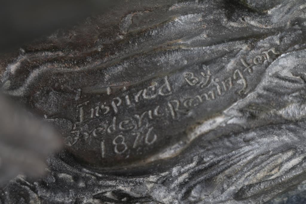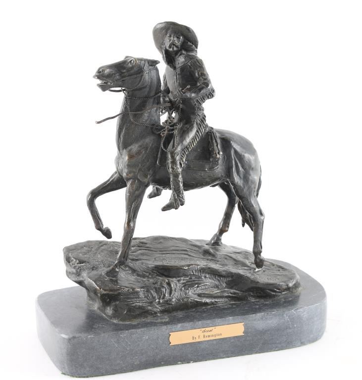 By Cowboy Artist Frederic Remington entitled "Scout" mounted on granite base. Signed on bronze base, an reads "Inspired by Frederic Remington" Measures 12x9".