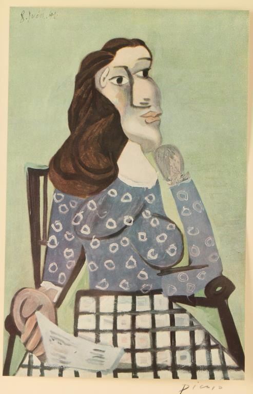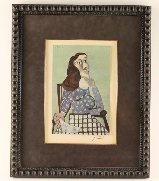 by Pablo Picasso from the folio "Seize Peintures from 1939-1943 Editions Du Chene Paris" Has original Picasso signature lower right hand corner. Depicting a lady in a thinking pose seated in a chair. 7"X11", in a molded black frame with purple suede matting.