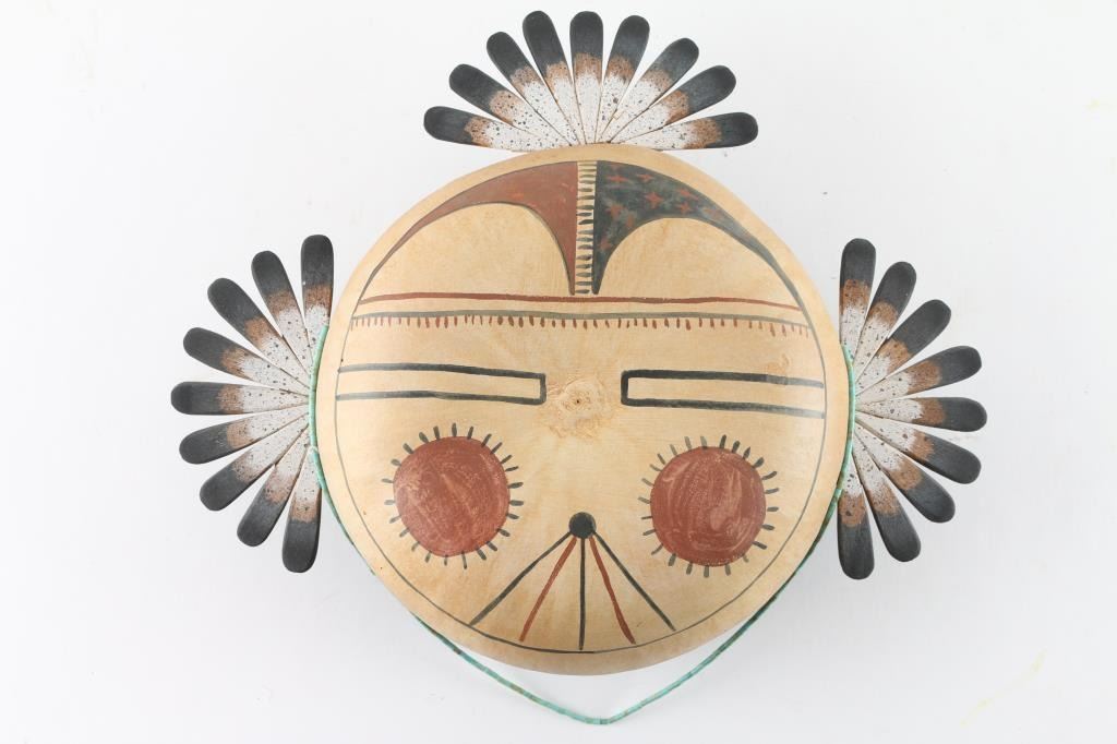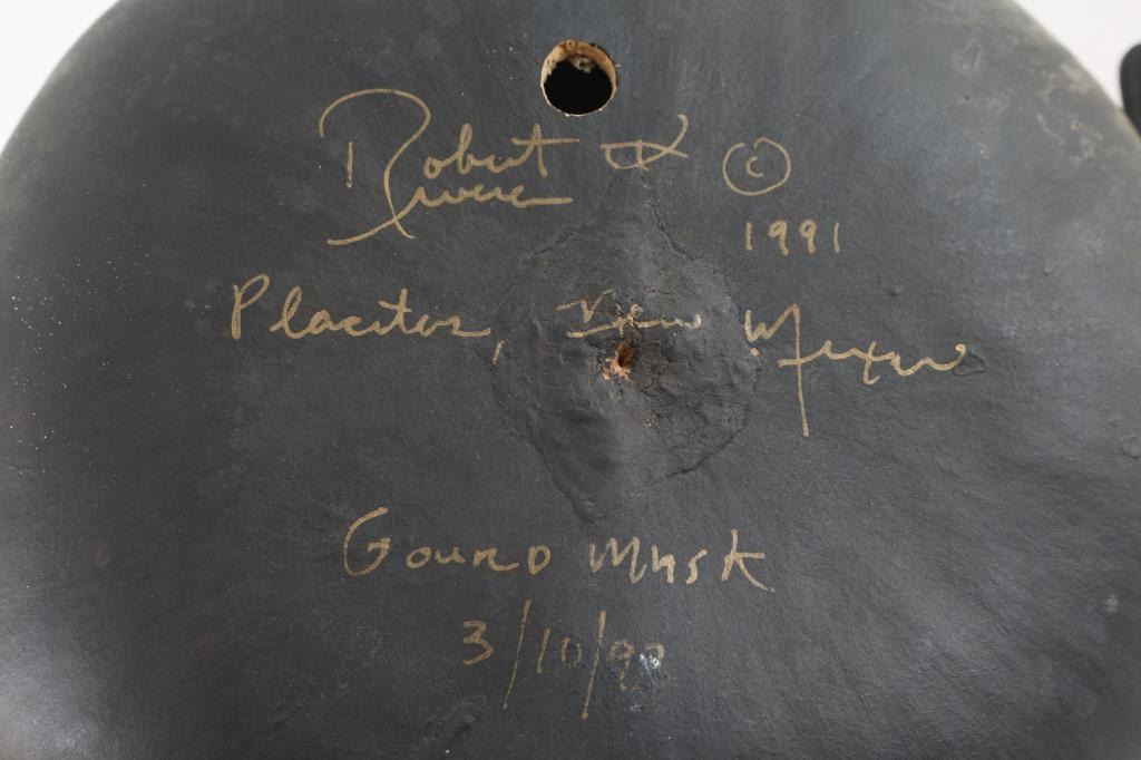 By Indian artist "Robert Riveria" signed on back and dated 1991, depicting on front is face Kachina eagle face. In good condition with turquoise necklace accented around neck of mask.