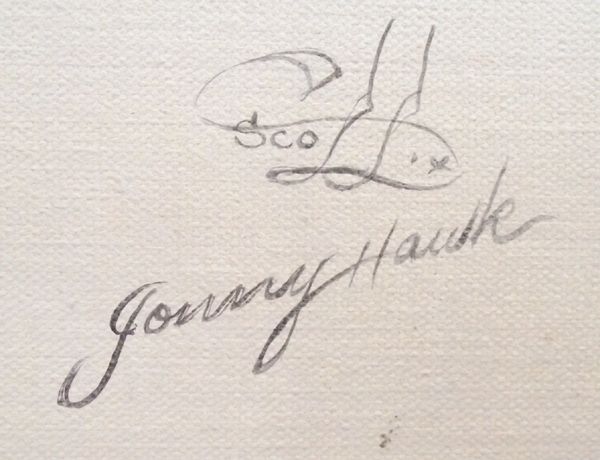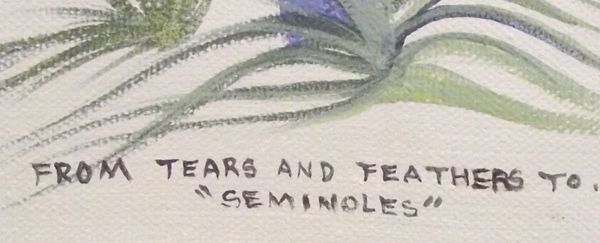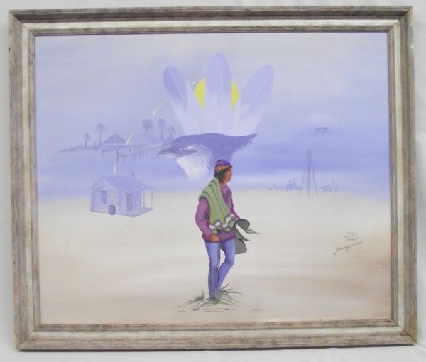 Original Framed Art - Jonny Hawk. This painting is titled, '' From Tears and Feathers to Seminoles''. Strong colors of the figure with pastels indicating a dream sequence. Frame is in good condition. 23.5''H x 28.5''W. Ready to hang.