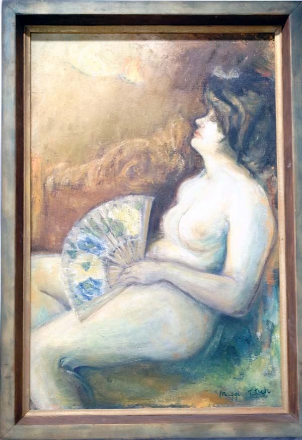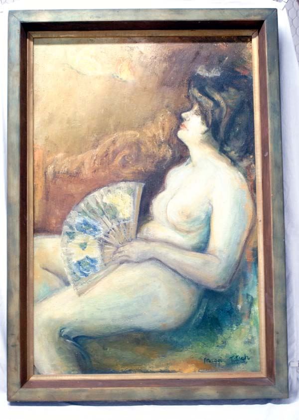 Vintage Original Framed Nude on Canvas by Silver City New Mexico artist Maggi (Margaret) Tatsch (Jun 14, 1912-August 3, 2004), visual measures 23'' x 34'', signed in lower left corner and on back by artist