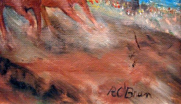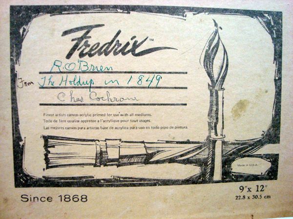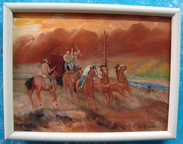 Original Oil Painting, ''The Holdup in 1849'' by arist R.O. Brien after Charles L. Cochrane. Cochane was born in the hills of Missouri on January 29, 1923. During World War Two ''Chuck'' Cochrane served in the First Marine Parachute Regiment in the South Pacific. Upon discharge, he returned to Missouri to attend Moran School of Commercial Art and Kansas City Art Institute. In 1958 he moved to southern California where he began to paint a variety of subjects including western scenes. Painted on artist board, measures 9''H x 12''W, framed.