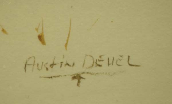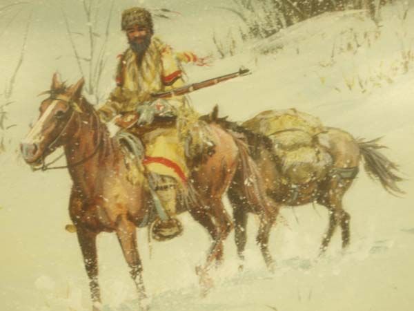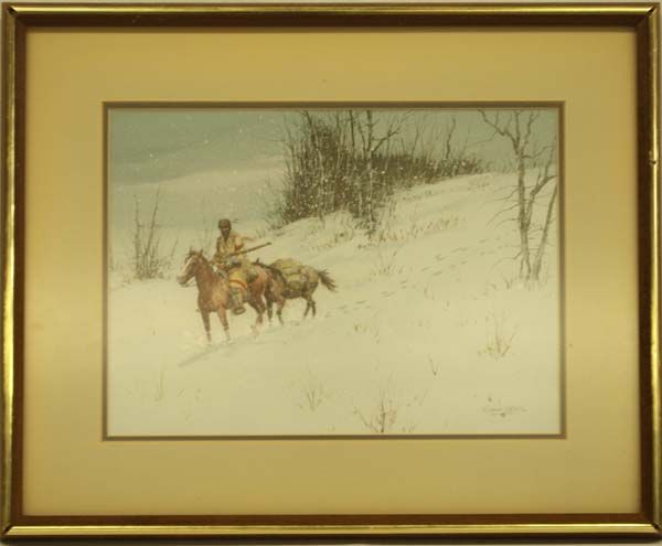Original Framed Oil ''Trapper and his Horses'' by Austin Deuel (1939-present), visual measures 10'' x 14.5'', depicts Mountain Man on horse with pack horse in tow, wintery scene, signed by artist in lower left corner