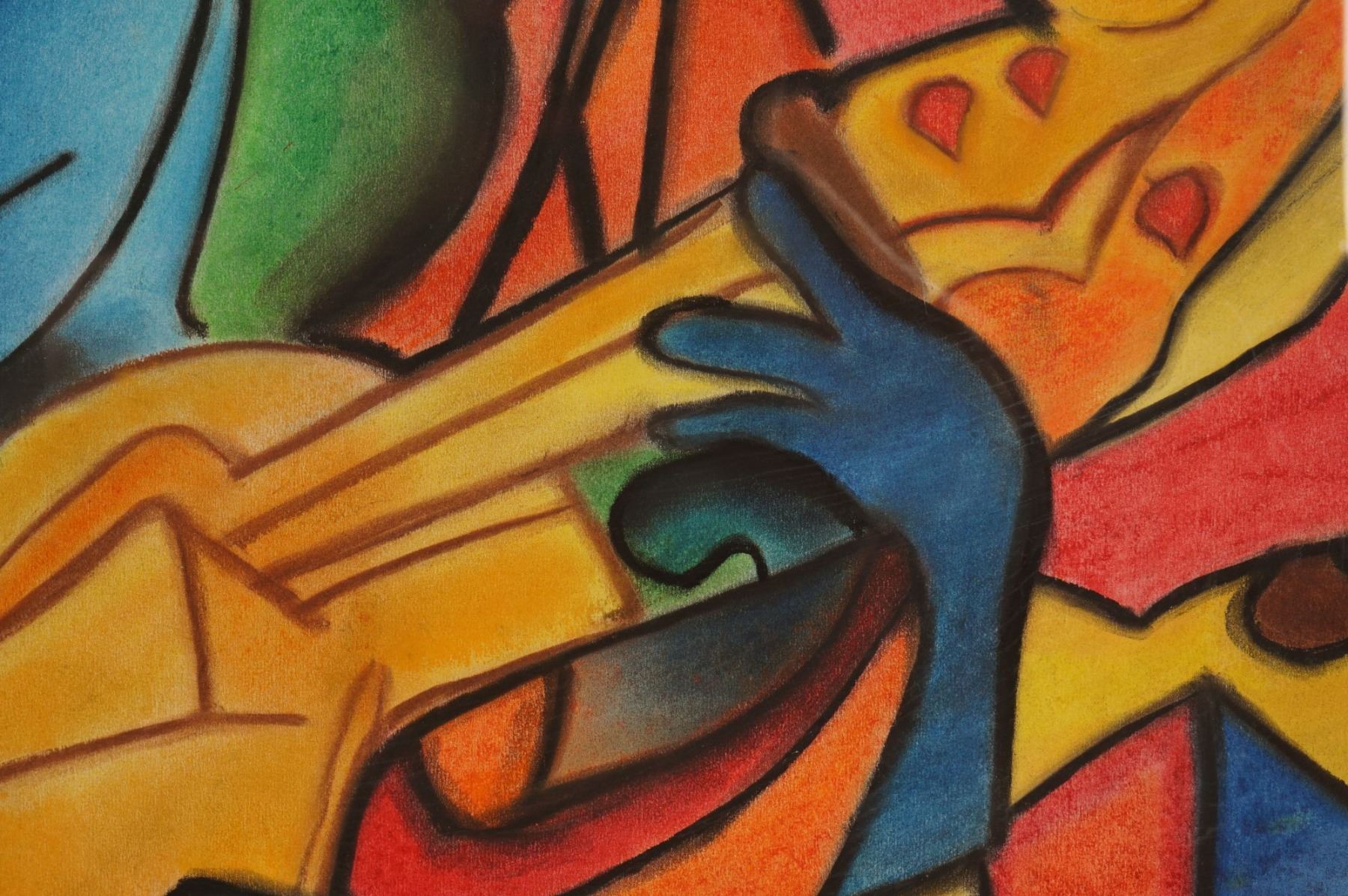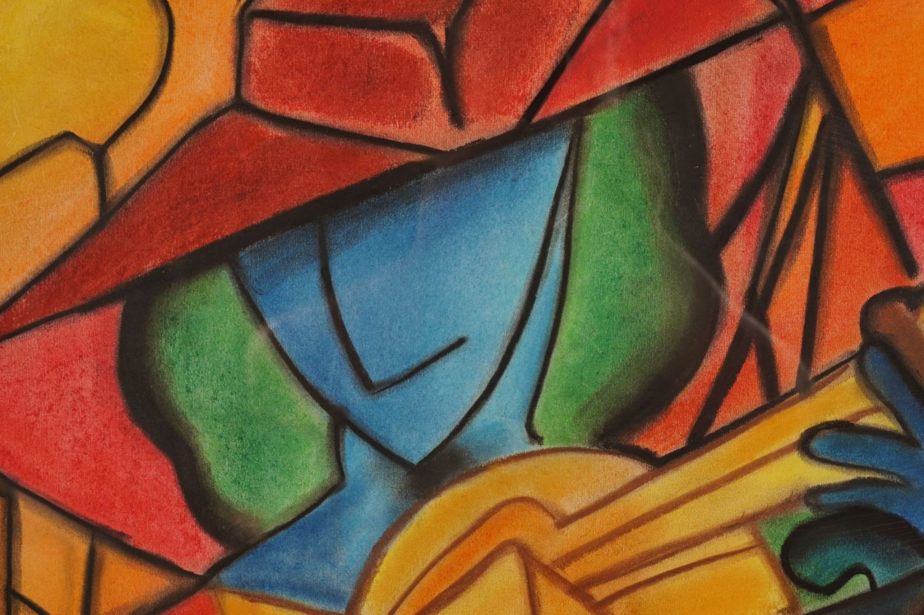 Original Framed Pastel on Paper, Abstract Cubist Musician, Signed