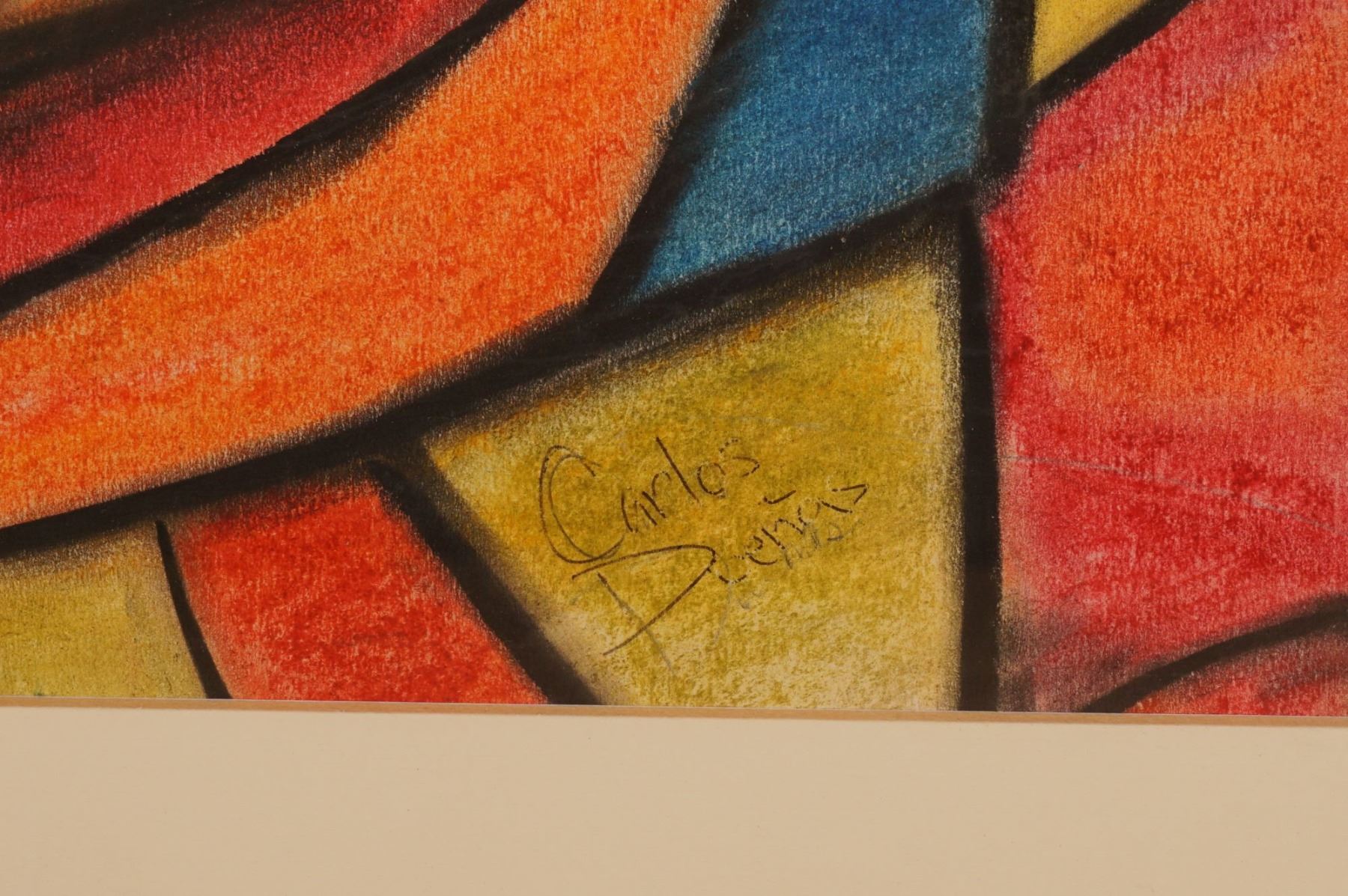 A dynamic and colorful pastel on paper that celebrates music and movement through an expressive cubist composition. The faceless blue figure, framed by vibrant hues of red, orange, and gold, strums a stylized guitar amid a radiant geometric background. The masterful use of soft pastel creates rich texture and depth, blending tones seamlessly to evoke rhythm and warmth. Signed lower right Carlos Denas (or Penas) and professionally matted in a black frame, this piece exemplifies the artist's passion for modern form and Latin artistic energy.