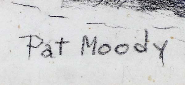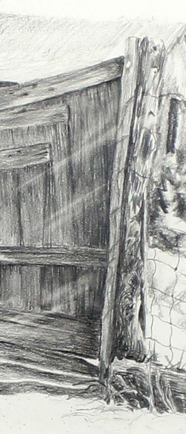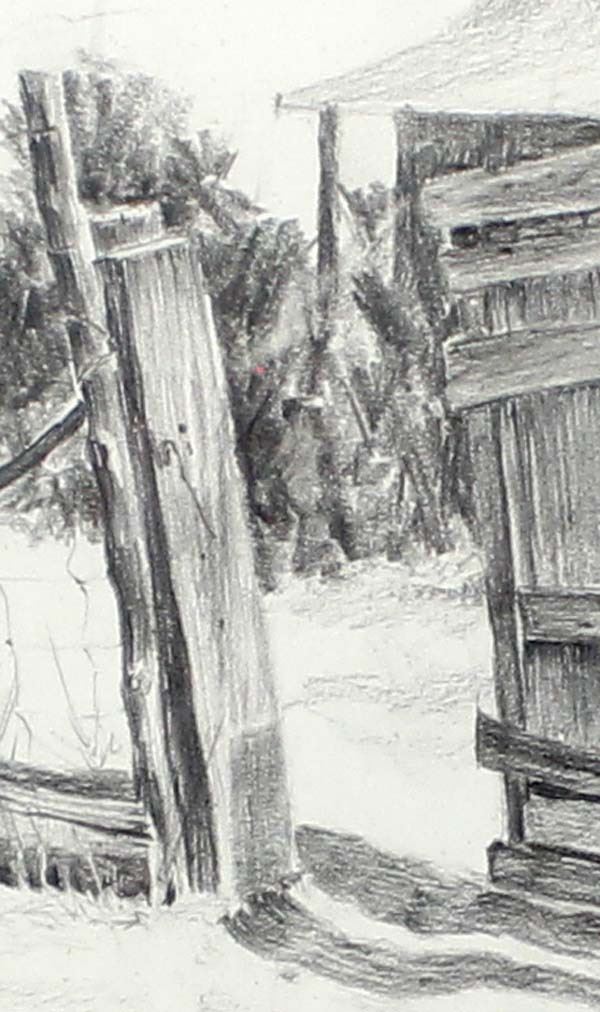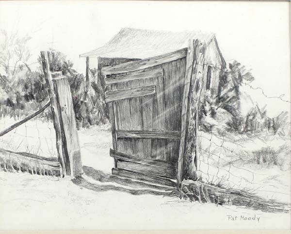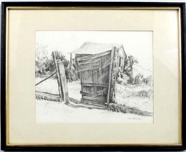 Original Framed Pencil Homestead Drawing by Pat Moody, visual measures 7.5'' x 9.5'', overall framed measurement of 12'' x 15'' and is matted