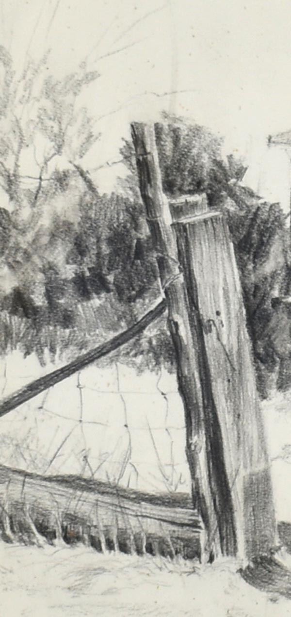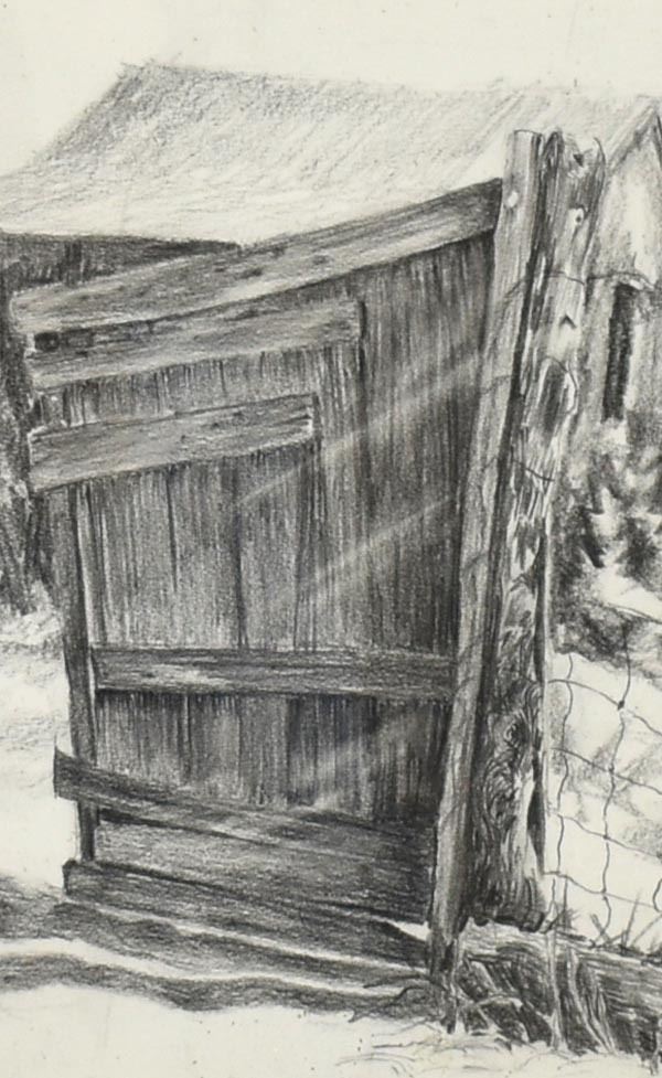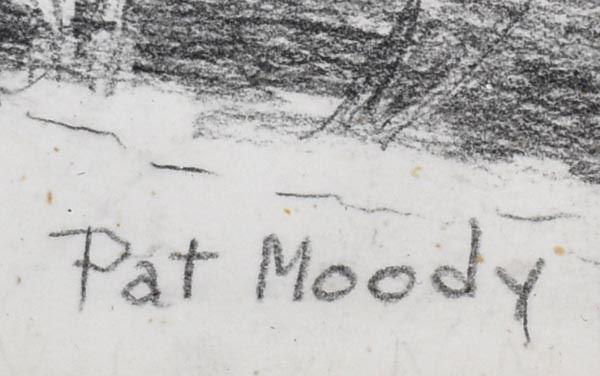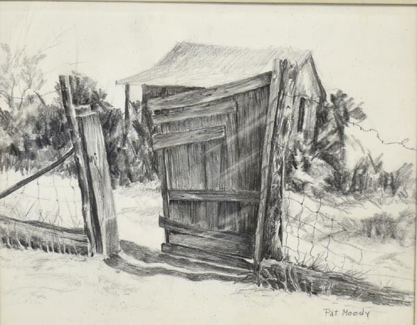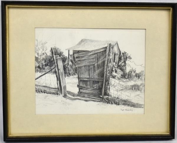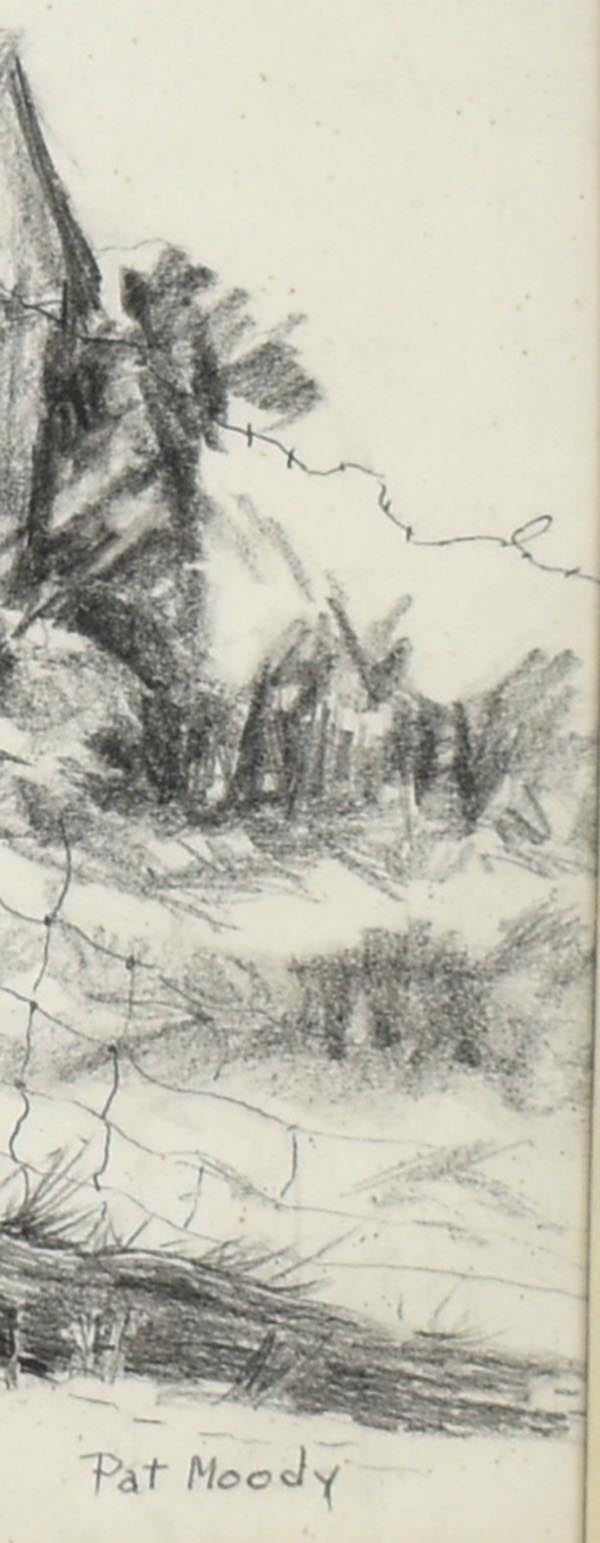 Original Framed Pencil Homestead Drawing by Pat Moody, visual measures 7.5'' x 9.5'', overall framed measurement of 12'' x 15'' and is matted and under glass