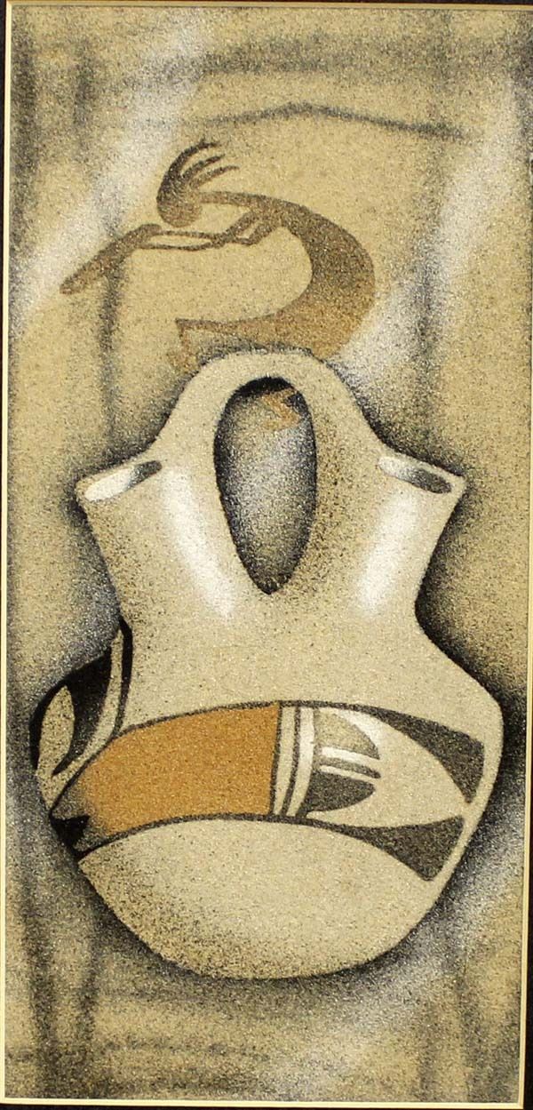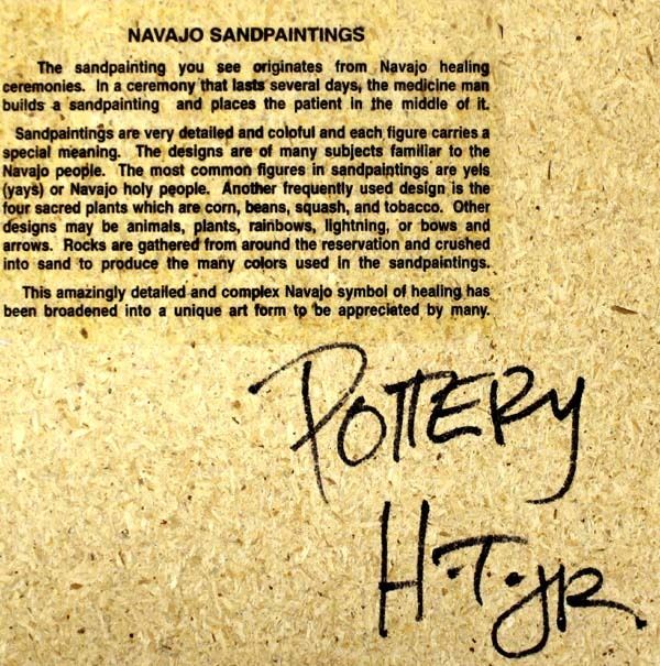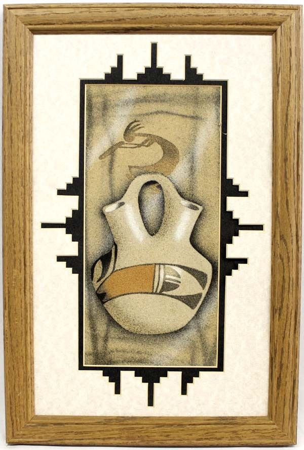 Massey Estate: Original Native American Navajo Framed Sand Painting by Herman Tyler, Jr., visual measures 11''L x 5.5''W, custom matting, signed on the back, FYI: ''Herman Tyler is known for his pottery sand paintings and has added the Kokopelli to them.''