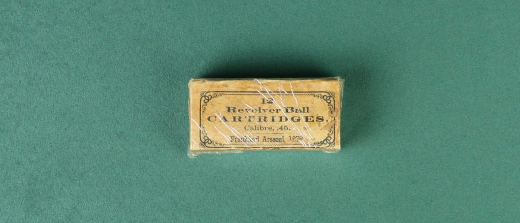 Original Frankford Arsenal 1878 or 1879 dated box of 12 .45 caliber Revolver Ball Cartridges in overall very good condition, sealed and with pull string still attached; majority of lettering visible; date’s lastnumber is missing lower portion. Est.: $250-$500.
