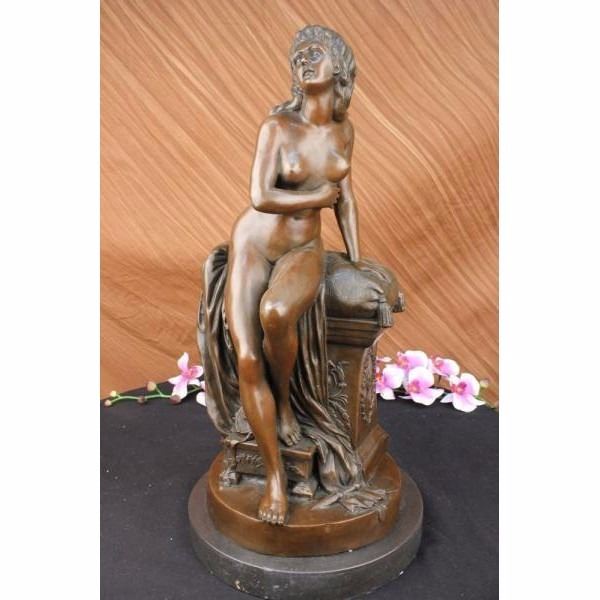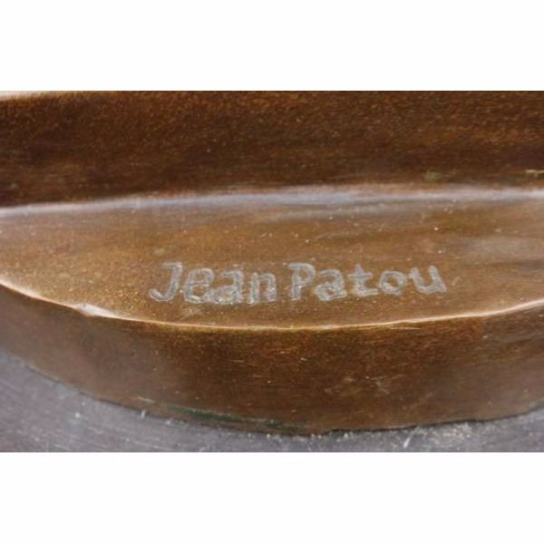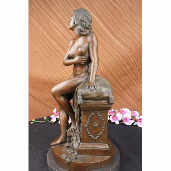 She is an artist's muse. She poses for a painting, sitting on the edge of a shut chest.She sits on a plump pillow and thin sheet that is draped over the side of the chest. She tucks her arm beneath her exposed breasts, grazing her fingertips along her skin. 100% bronze and handmade, this brown patina sculpture was cast using the "Lost Wax Method" and mounted on a marble base. It features the signature Jean Patou. Condition: This sculpture is in perfect condition. Bronze Dimensions with Marble Base:Height 20" x Width 10" Marble Dimensions: Diameter 10" Height without base: 19" Weight : 30 LBS Inventory 52DS07511625