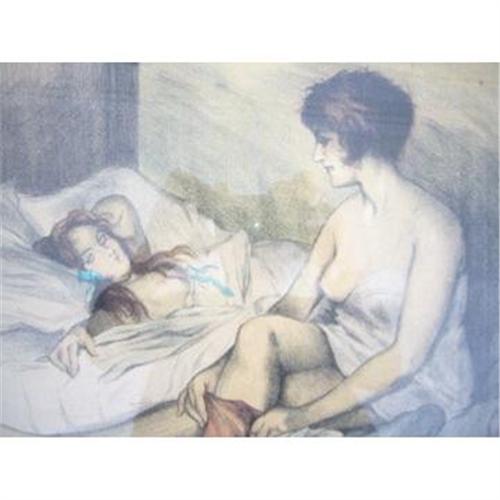 An evocative and supine boudoir view of two women - the inscription at the bottom of the piece (which is signed in the stone by an unknown artist) reads: "Parfois la solitude est peuplee de gens d'une absence charmante" - which loosely translates to "Occasionally, solitude is populated by charming, absent presences..", and the dedication reads "Cordialement a l'ami Treba", or "Cordially (fondly), to my friend Trebla"...