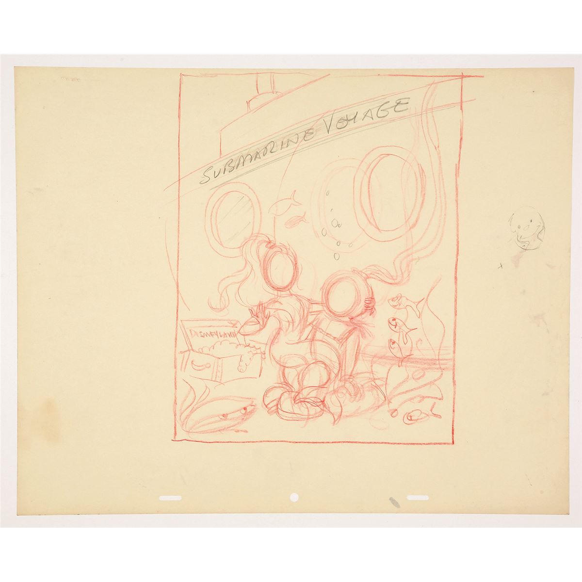 (Disneyland, 1959) This original drawing was the design used for one of the Submarine Voyage themed cut-outs. Accomplished in graphite and colored pencil on untrimmed 15.5”x12.5” animation paper. Artwork is in fine condition with very little wear. Image size is 8”x10.5”. An example of a “Fun Photo” using this scene, can be found in the souvenir section of this catalog.
