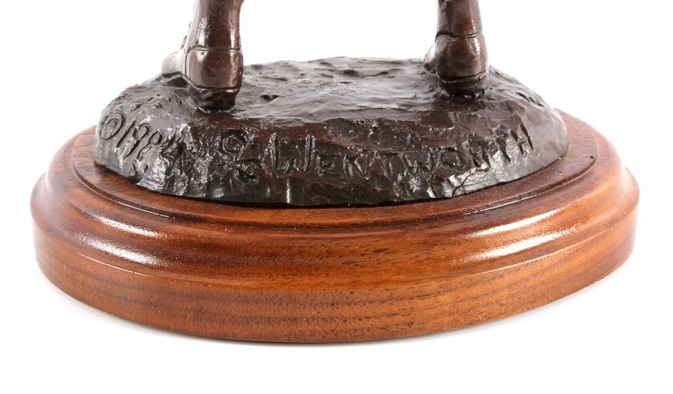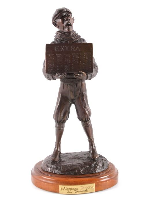 This is an original G.C. (Gerry) Wentworth bronze sculpture titled "Afternoon Edition". Gerry Wentworth was a Great Falls, Montana artist who grew up in the era just after Charles Russell's life. He was largely self taught and spent the majority of his life working in painting, sculpture and wood carving. Wentworth's works have been widely exhibited in such places as the C.M. Russell Show, the Phippen Art Show and the Frank Tenney Johnson Show. In 1981, he won Best of Show at the Northwest Americana Art Show. The bronze shows a paperboy from the early 1900's selling the afternoon newspaper. The piece shows fine detail and is in good condition. The bronze sits on a solid walnut hardwood base with a brass placard that reads"Afternoon Edition / G.C. Wentworth". It has been signed by the artist and is numbered 3/20. The bronze measures 4.25" x 5.25" and is 10.25" tall. It comes with a printed biography of the artist and a Certificate of Authenticity. The original gallery retail price for this piece was $1,200.