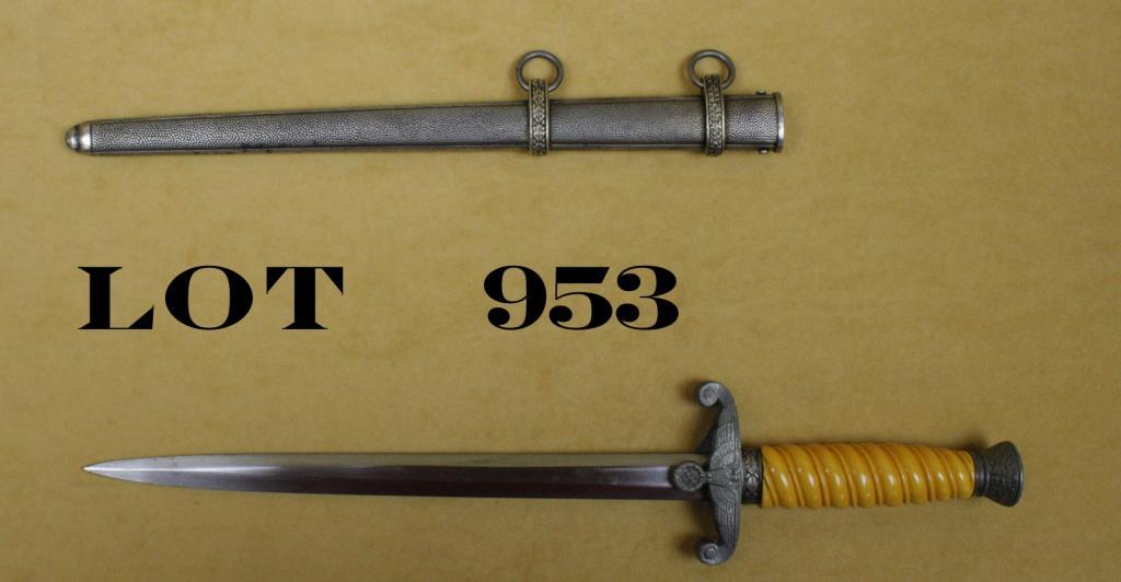 Original German Army dagger and sheath approx. 15” overall with an approx. 10” plain blade marked “E & F Horster, Solingen” at the hilt, spread eagle over swastika cross guard, ivory colored grips without wire wrapand floral decorated metal pommel; both the dagger and scabbard are in overall very good condition with both hanging rings present. Est.: $300-$600.