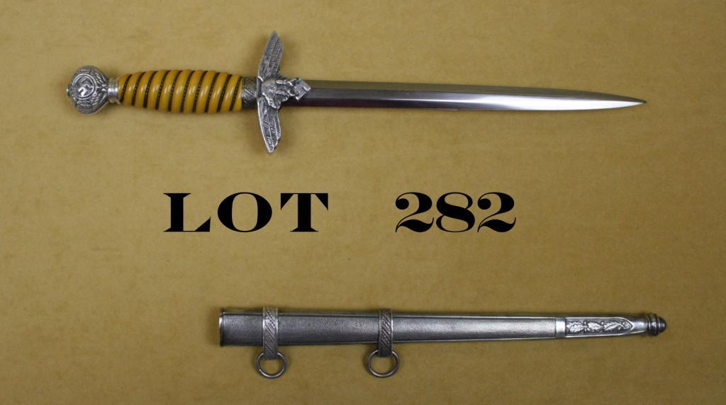 Original German Luftwaffe dagger and sheath with plain blade marked “E & F Horster, Solingen” approx. 17” overall with an approx. 10” blade. This dagger is in overall excellent condition with dark yellowivory-like wire wrapped grip, eagle over swastika cross guard and swastika pommel; the metal sheath is also excellent with hanger rings and usual leaf patterns. Est.: $350-$700.