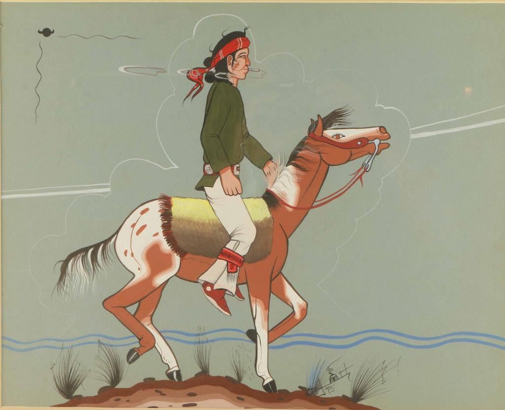 Depicting Native American on horse, signed lower right. Image measures 15 3/8" x 19 3/8" in single mat with wood frame that shows wear.