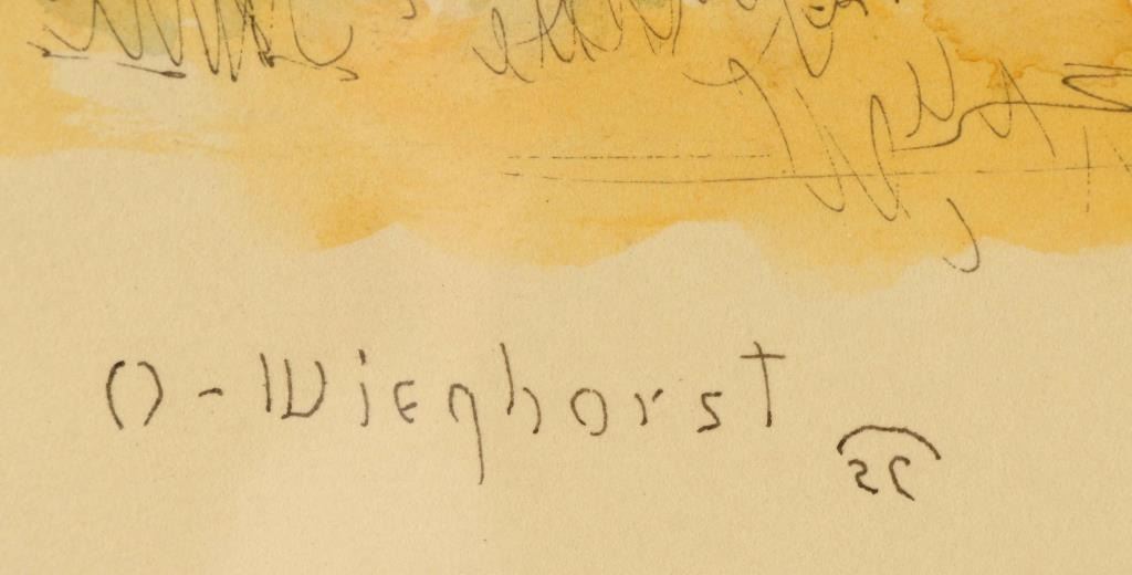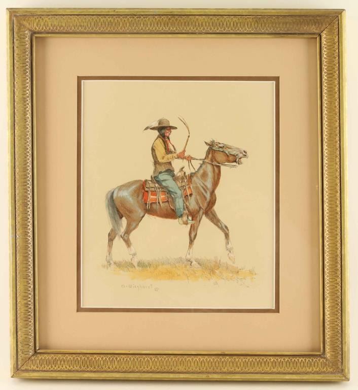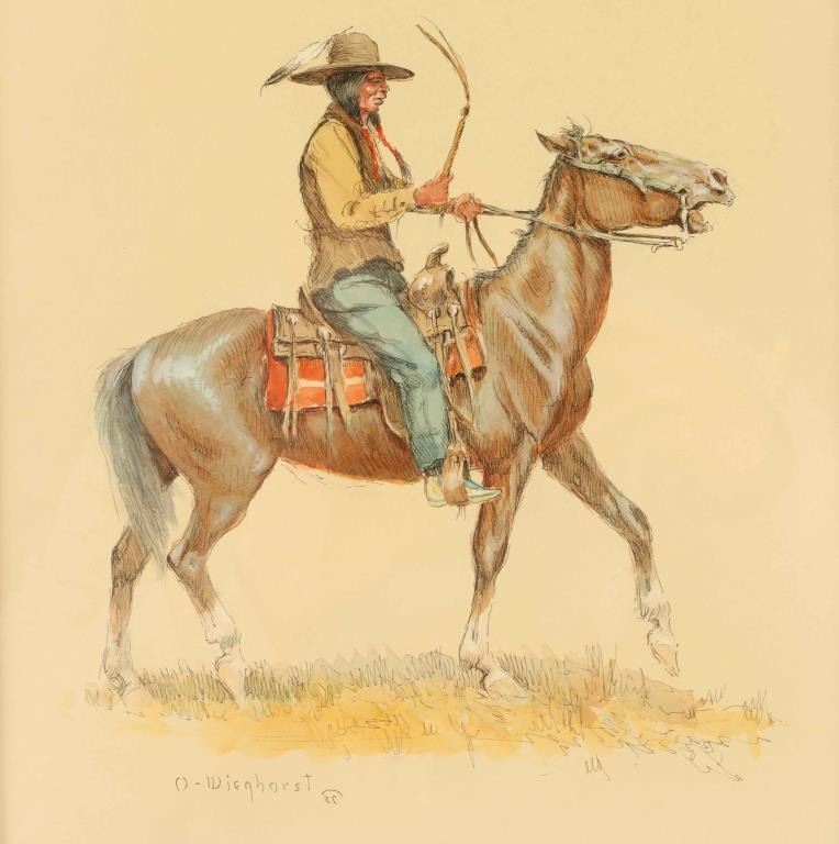 depicting Indian on horseback holding a quirt. Signed lower left 'Olaf Wieghorst' with 2C brand.. Image measures 10 7/8" x 9" in a double mat and gold wood frame. Excellent condition. He arrived in the U.S. in 1918, joining the U.S. Cavalry, & patrolled the Mexico border in New Mexico & Arizona . When he mustered out of the army, he drifted, ending up as a wrangler on the Cunningham Ranch near Alma, New Mexico. By the mid-twenties, Wieghorst was in New York City, working as a mounted policeman - his relationships with the many horses that were a part of his life became the common denominator of his paintings. Living in California by the end of WWII, he began a career that spiraled to success, in part due to his engaging personality. His paintings have appeared in numerous solo & retrospective exhibitions including the National Cowboy & Western Heritage Museum, Oklahoma City (1974), The Tucson Museum of Art, Arizona (1981), & the San Diego Historical Society, California (2002). -AskArt