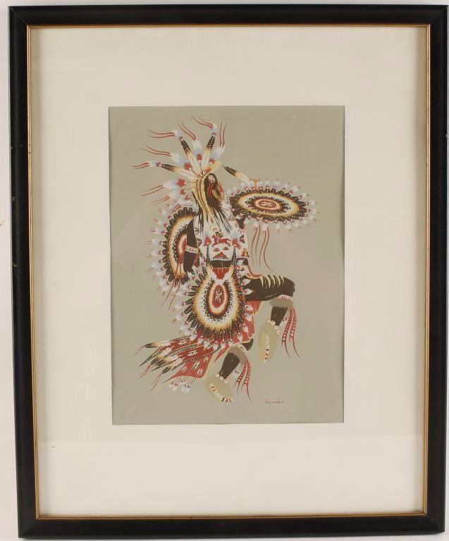 by renowned artist Woody Crumbo, measures 12"x8/12". His paintings are held by several major museums, including the Smithsonian Institution and the Metropolitan Museum of Art, with a large collection at the Thomas Gilcrease Institute in Tulsa, Oklahoma. Crumbo was a 1978 inductee into the Oklahoma Hall of Fame for his paintings. He was appointed as an "ambassador of good will" for Oklahoma in 1982 by Governor George Nigh.