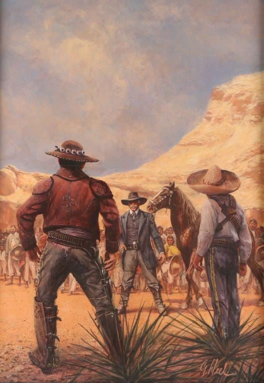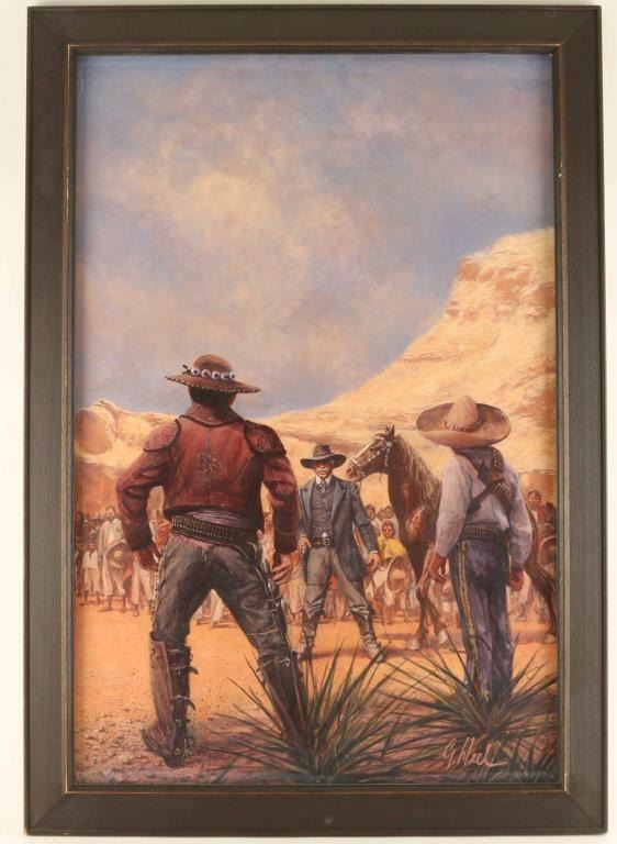 depicting Desperado gunfight in the desert. Signature lower right. Image measures 30"x19 1/2" in wood frame.