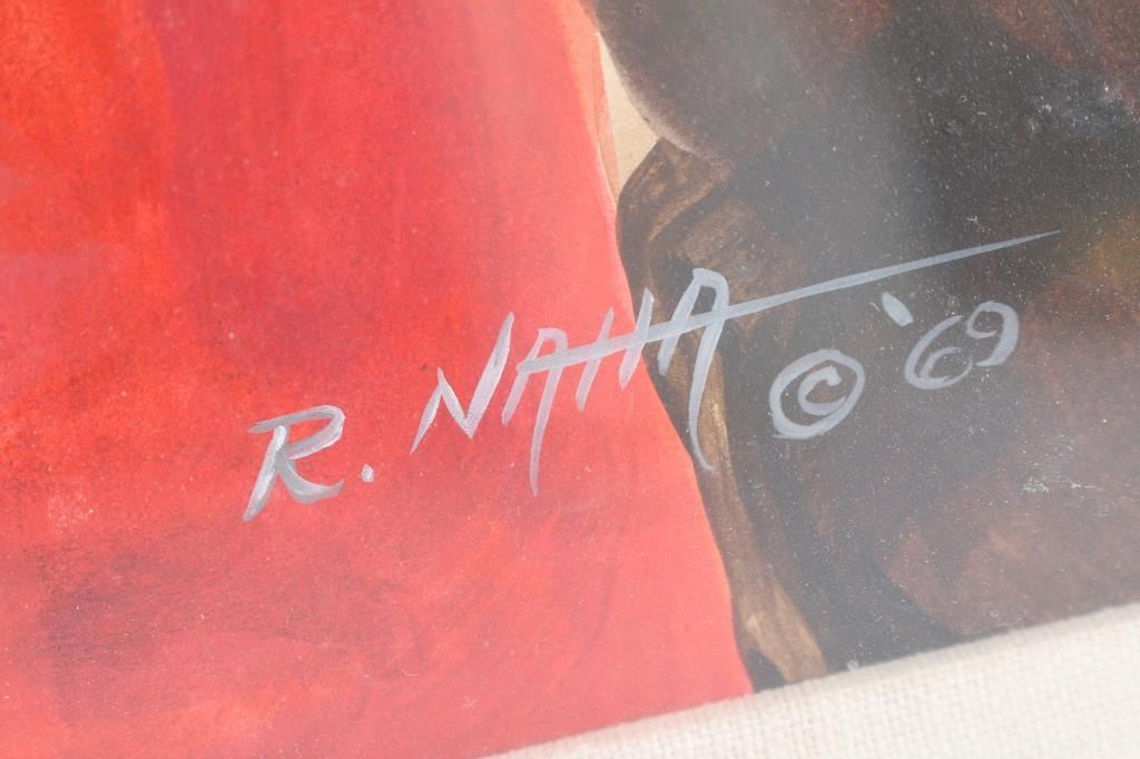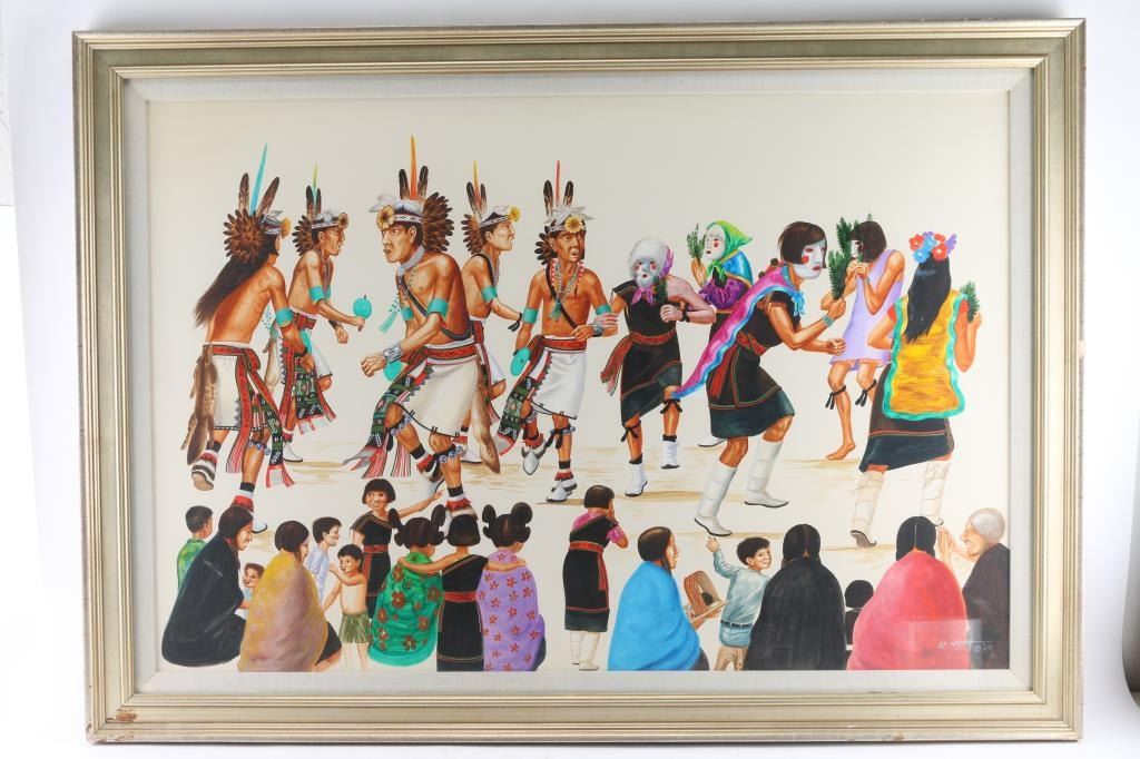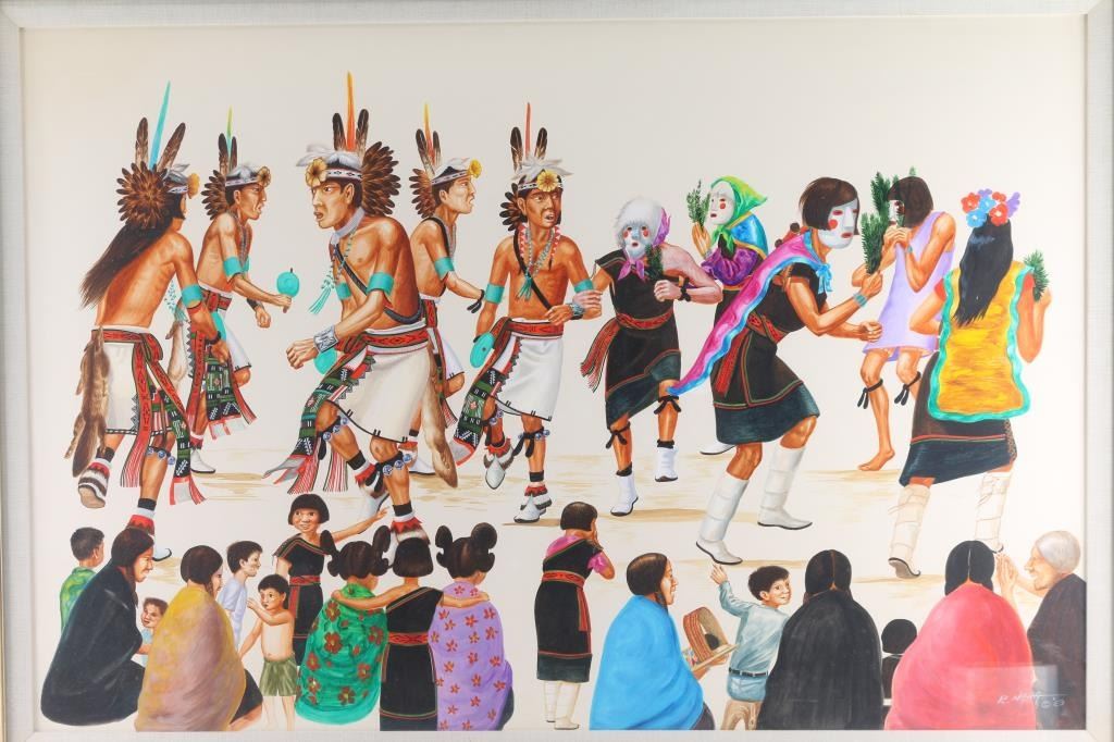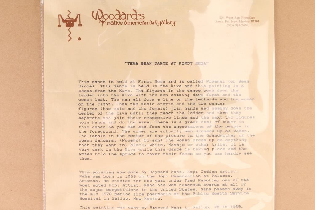 By noted Indian artist Raymond Naha. Entitled Tewa Bean Dance at First Mesa. Includes Paper from the Woodard's Native American Art Gallery. Raymond Naha is a well known Arizona artist, known for his ceremonial figures and indian motifs. From the Estate of Steve Goldstein, Scottsdale, AZ.