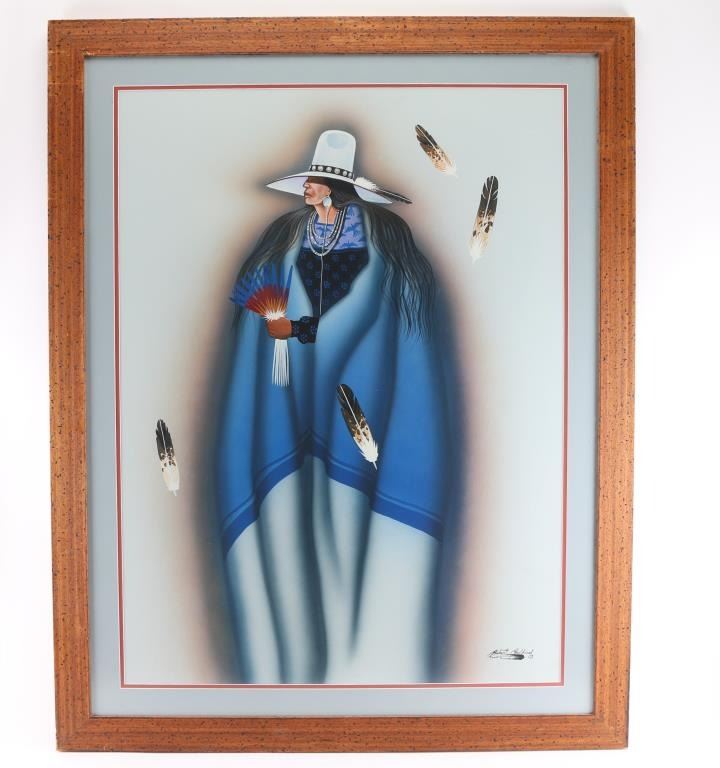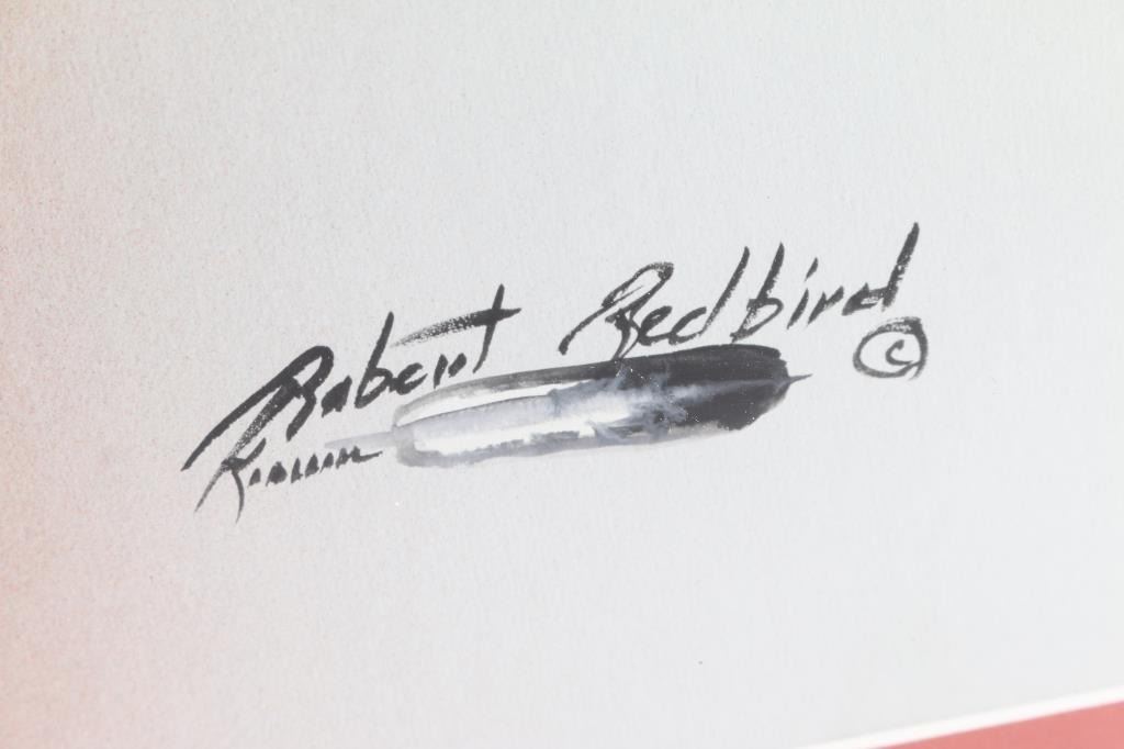 By noted Indian artist, Robert Red Bird, signed lower left corner. Depicts Indian man with cowboy hat. Double matted and framed. 36x27".