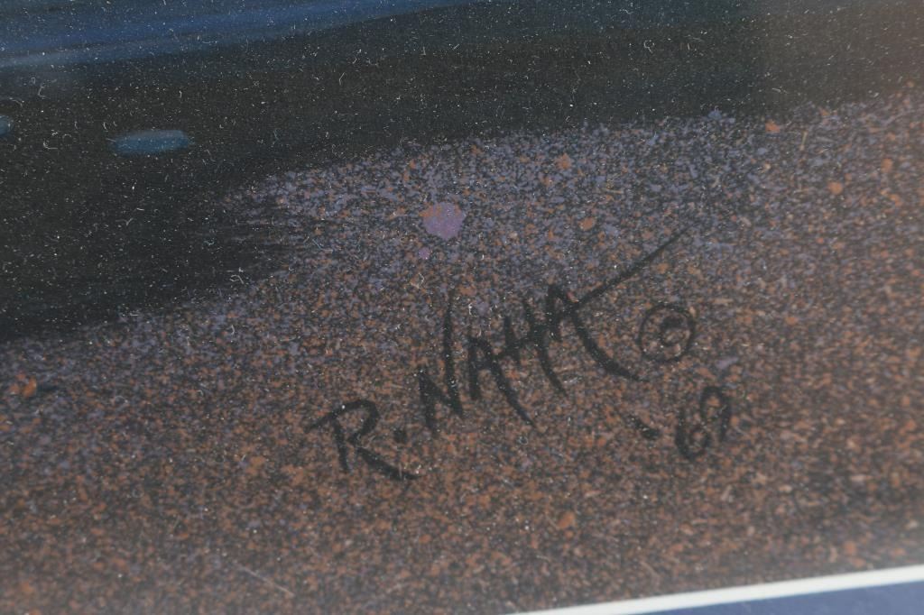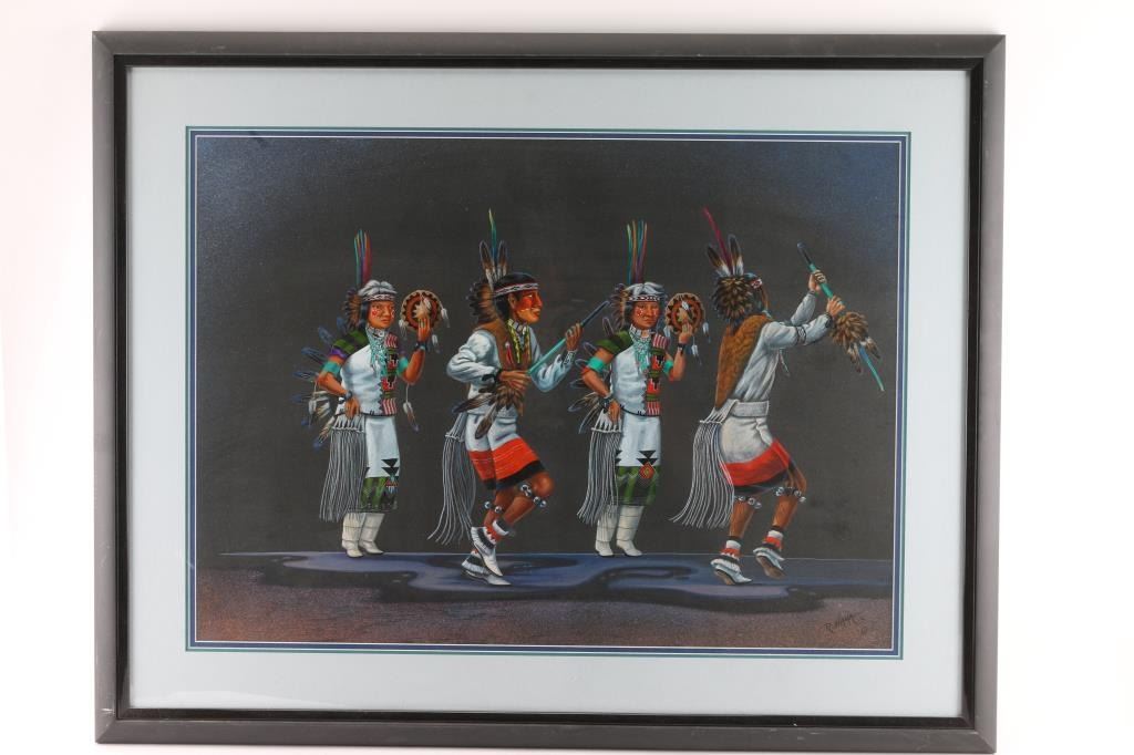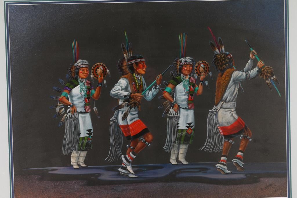 By noted Indian artist Raymond Naha. Depicting 4 Indian dancers. Hand signed lower right, dated 1969, 28 1/2 x 21". Raymond Naha is a well known Arizona artist, known for his ceremonial figures and indian motifs. From the Estate of Steve Goldstein, Scottsdale, AZ.